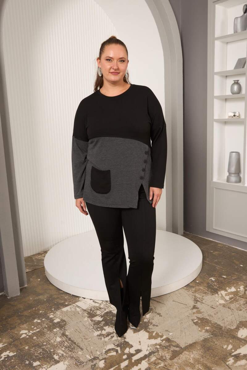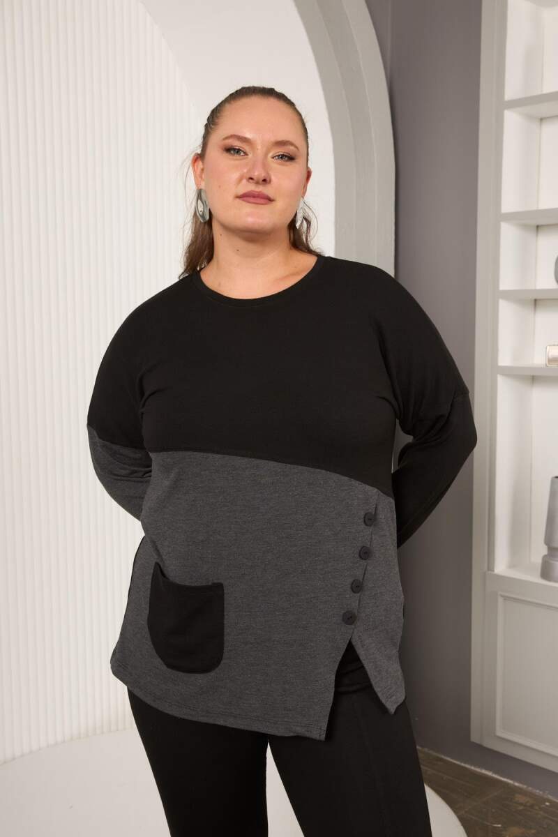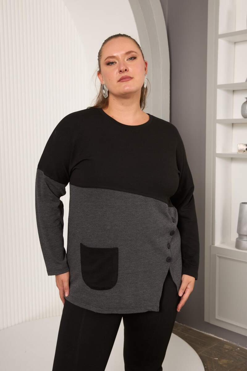 Büyük Beden Önü Düğme ve Cep Detay Bluz Siyah