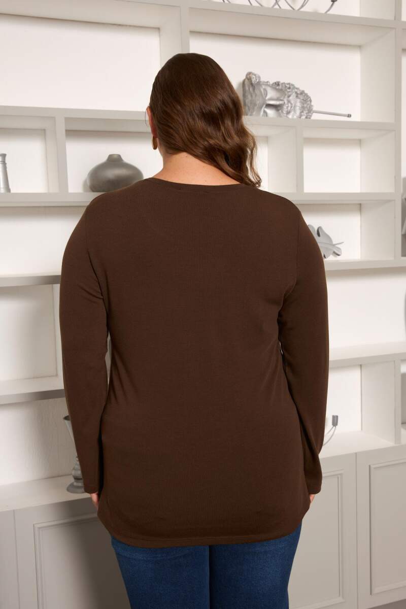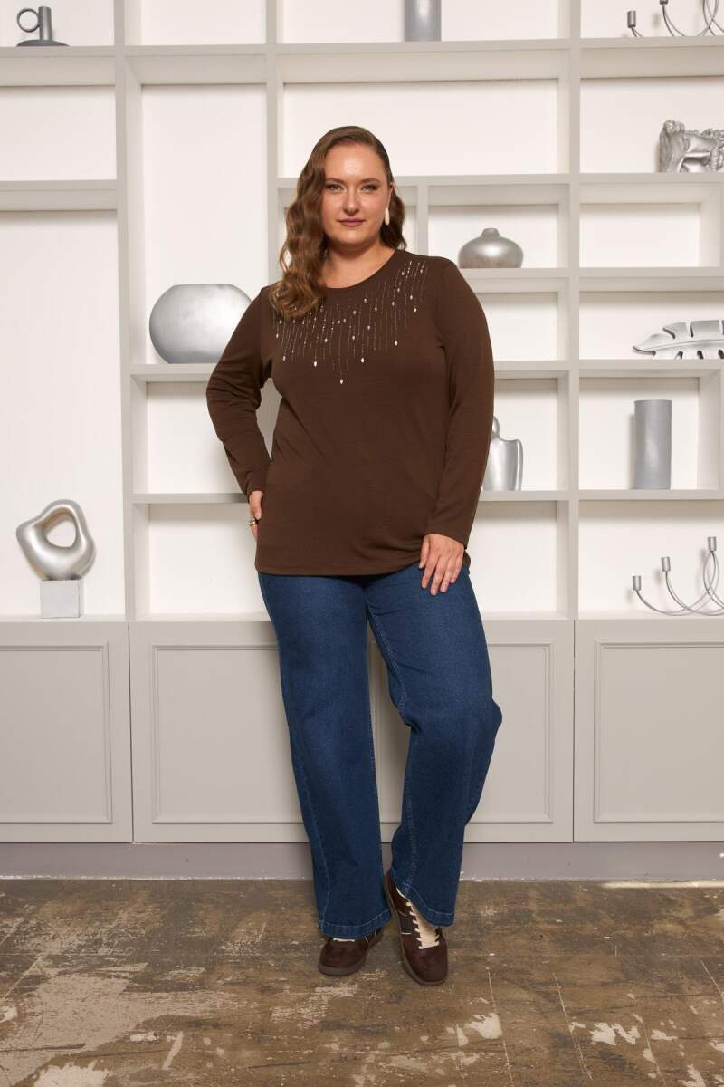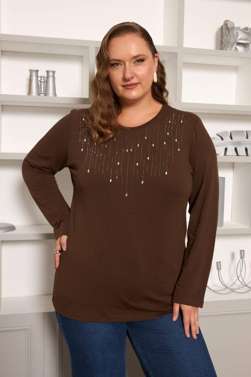 Büyük Beden Önü Taş Detay Bluz Kahve