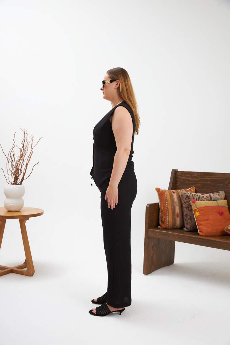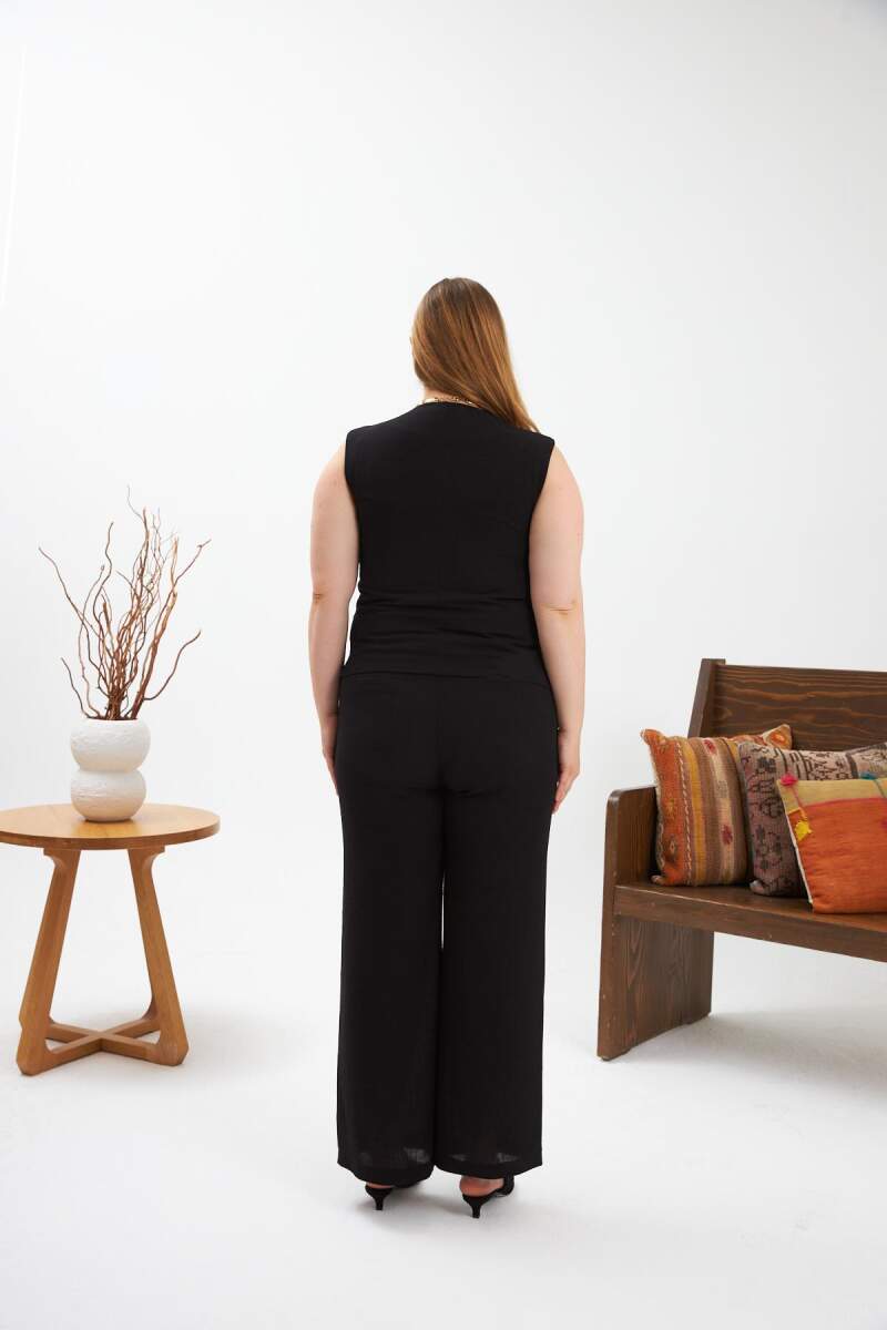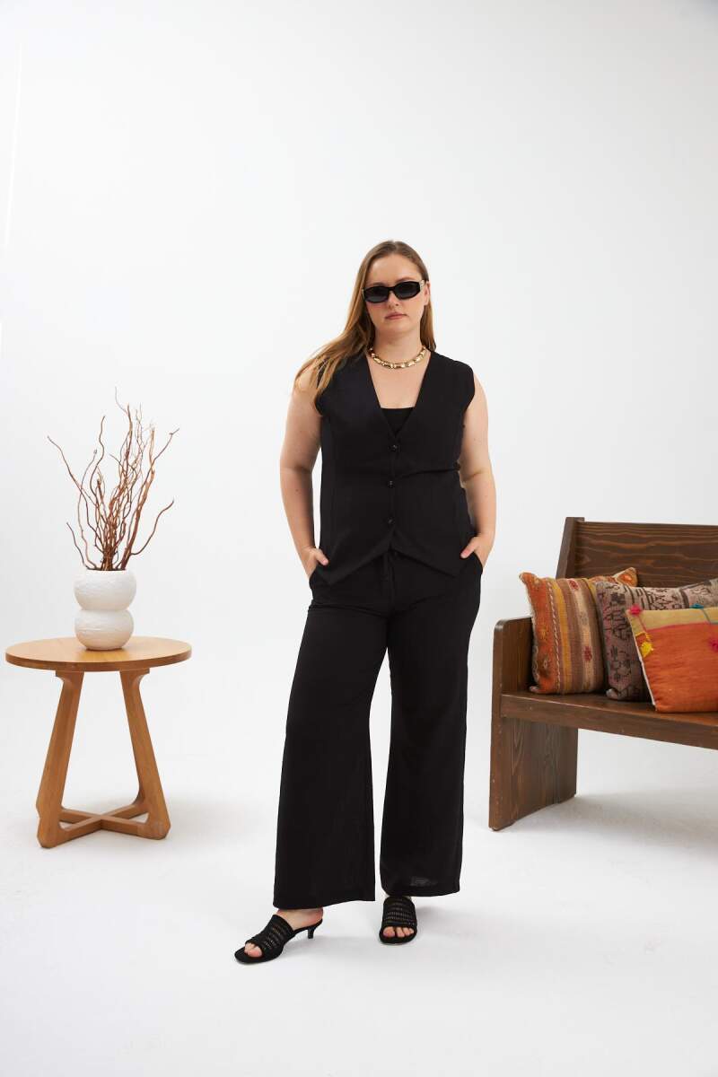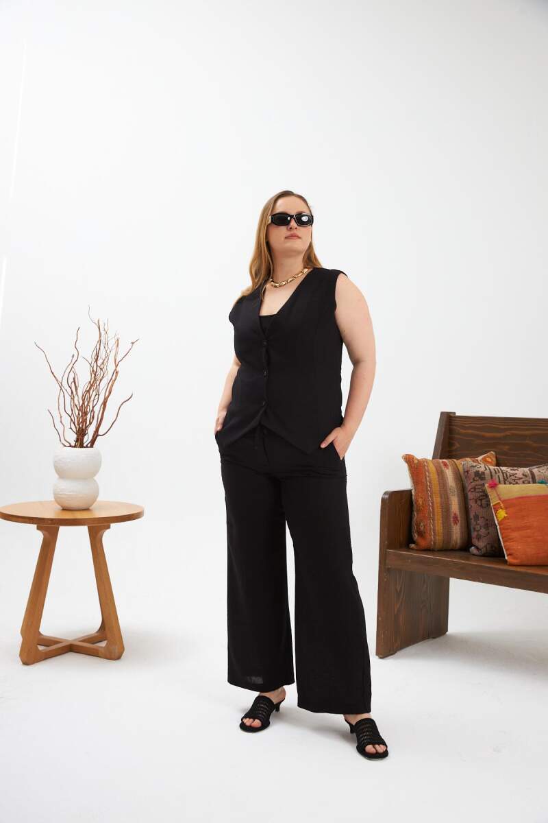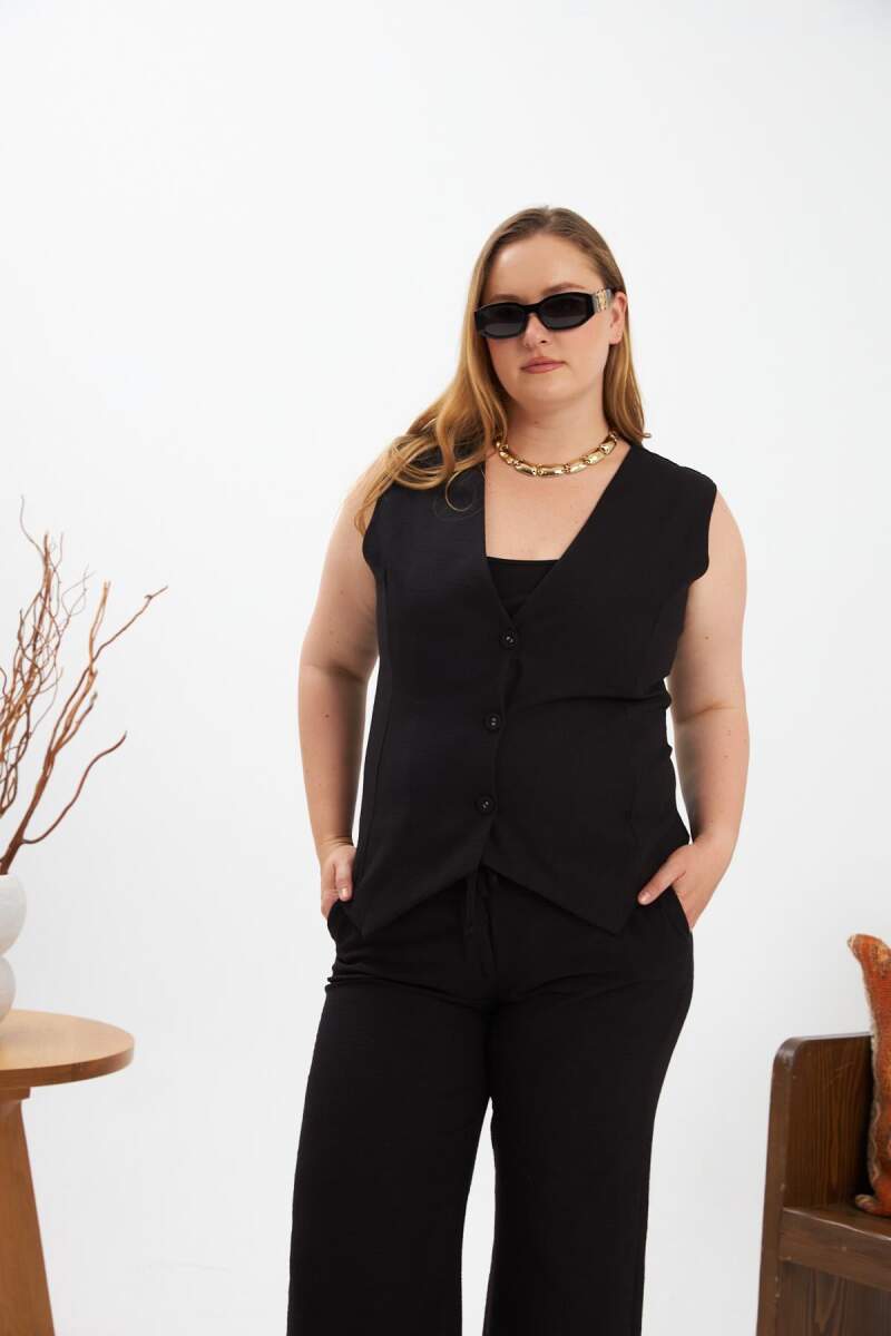 Şıklığı ve konforu bir arada sunan büyük beden pantolon yelek ikili takım, siyah rengiyle her ortama uyum sağlar. Modern kesimi ve zarif tasarımıyla gün boyu rahatlık sunar. Özel günlerde veya günlük kullanımda stil sahibi bir görünüm vadeder.