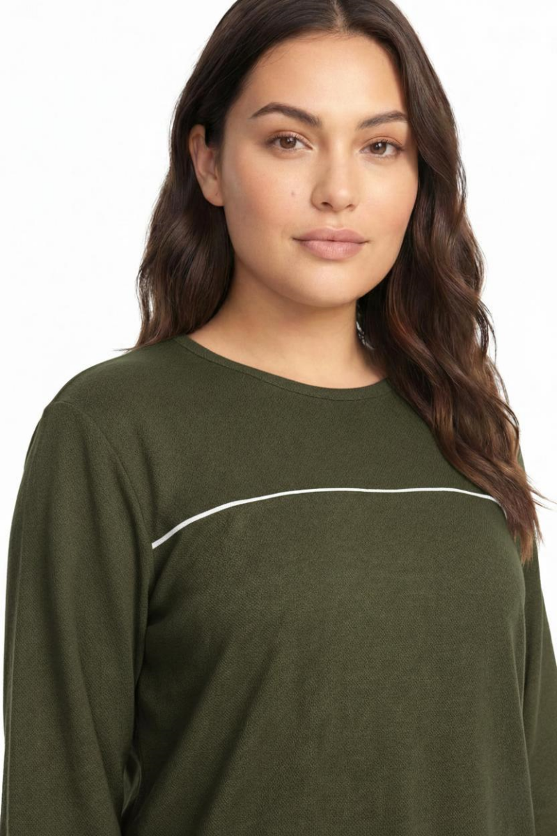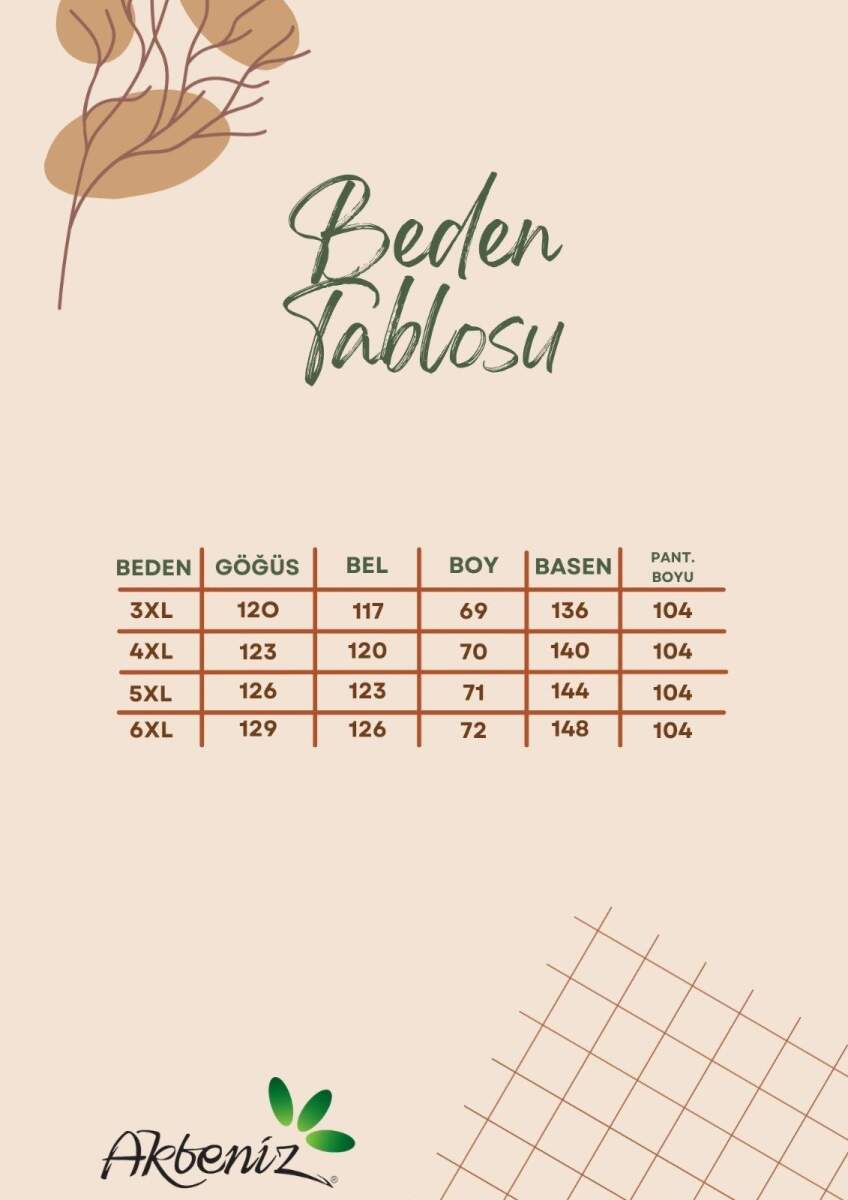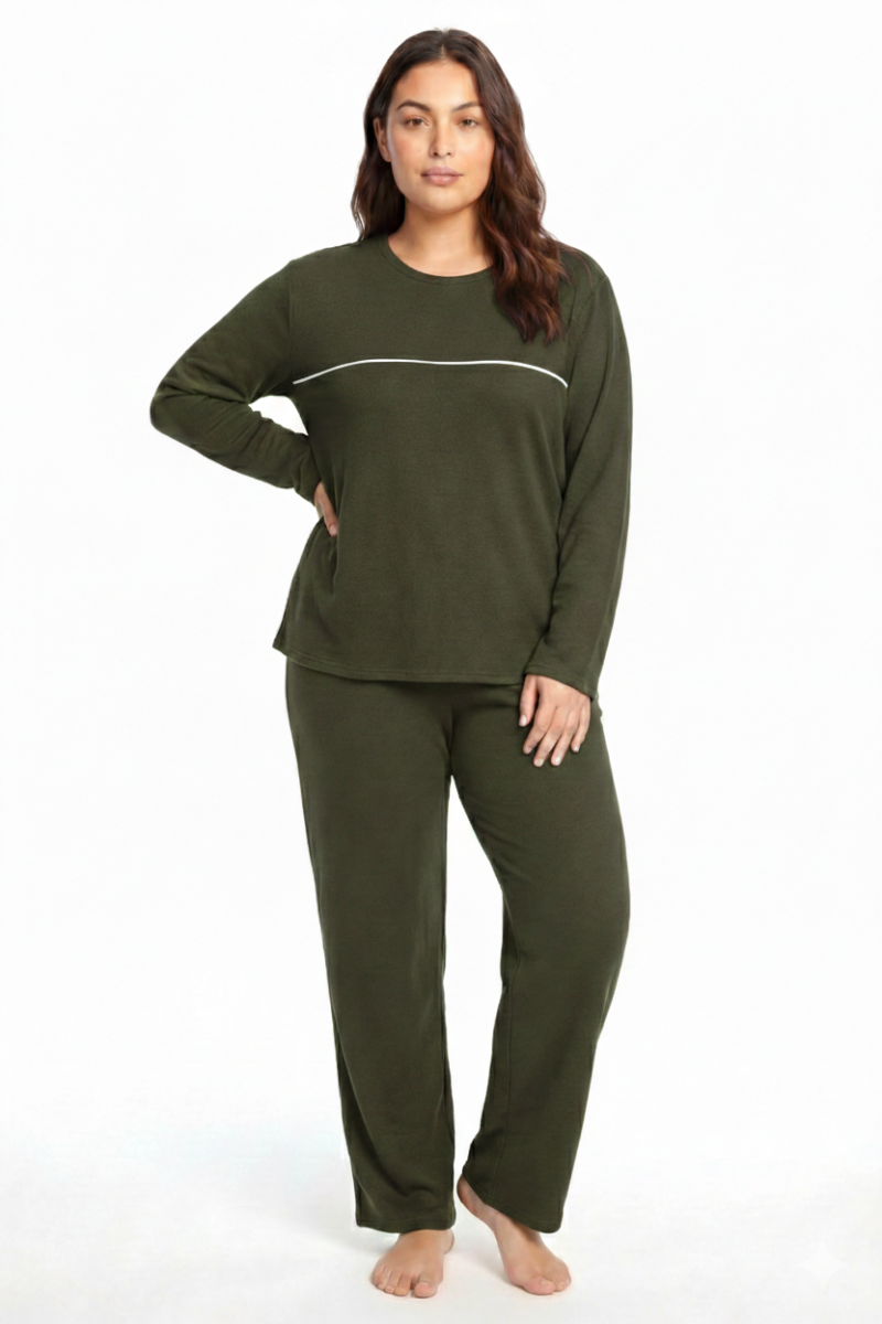 Zamansız haki rengi ve minimal şerit detaylarıyla ev giyimine sade bir şıklık kazandıran bu pijama takımı, büyük beden rahat kalıbı sayesinde gün boyu konfor sunar. Yumuşak dokusu ve esnek yapısıyla hem uyku saatlerinde hem de ev içinde keyifli bir kullanım sağlar.