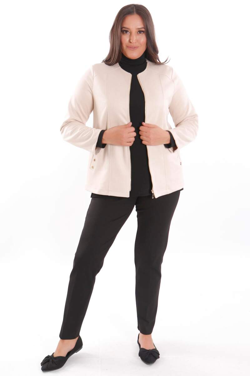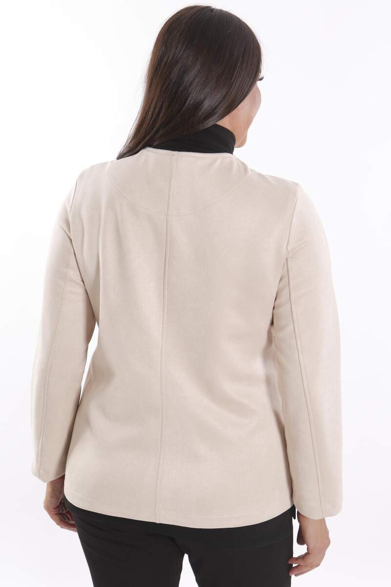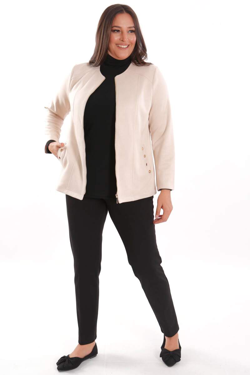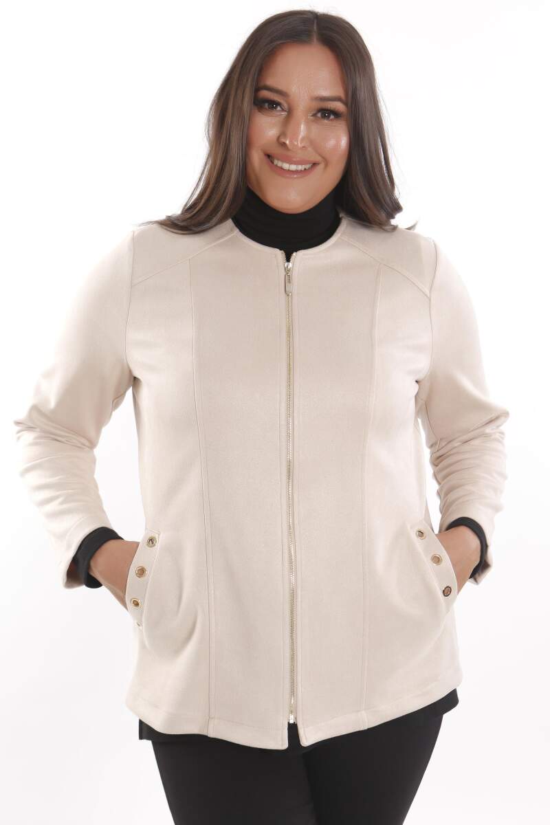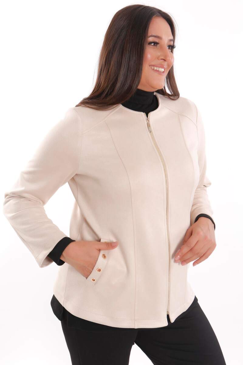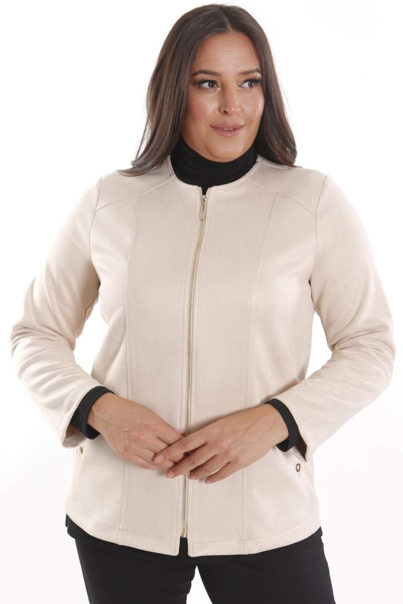 Süet malzemeden üretilen, yumuşak dokusu ile dikkat çeken süet ceket, rahatlığı ile günlük yaşamın ayrılmaz parçası.Kuş gözü cep detayı ile şık bir tasarım.Bluz,gömlek,pantolon ve eteklerinizle rahatlıkla kombinleye bileceğiniz fermuarlı taş süet ceket.