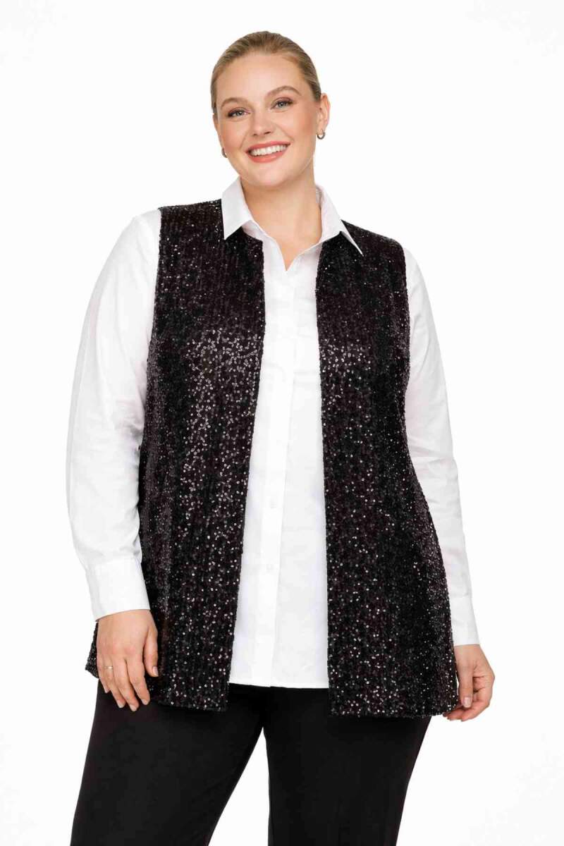 Büyük beden payet yelek, baseni örten uzunluğu ve bol kesimiyle hem şık hem rahat bir kullanım sunar. Geniş ve akıcı formu sayesinde beden sorunu yaşamadan konforlu bir şekilde tercih edebilirsiniz.