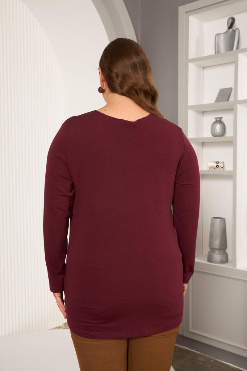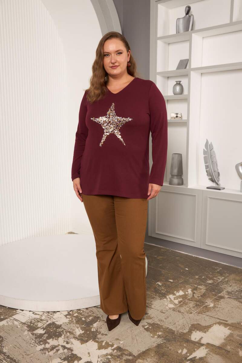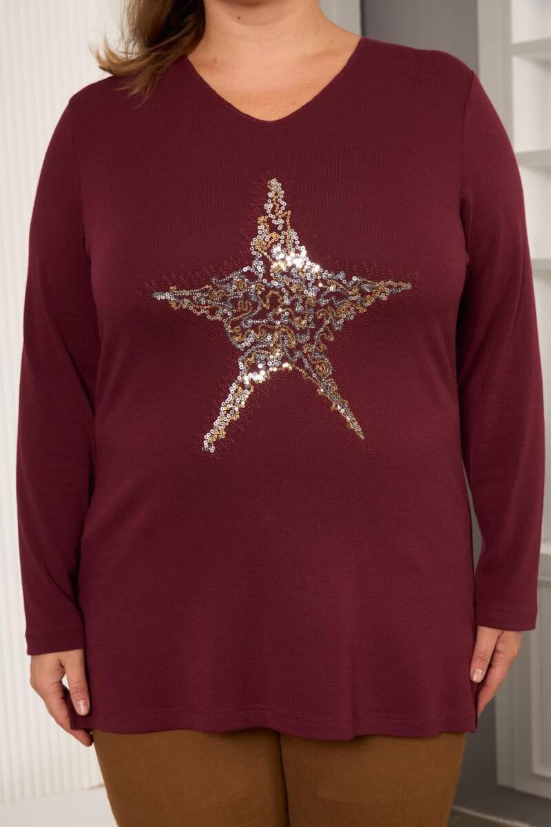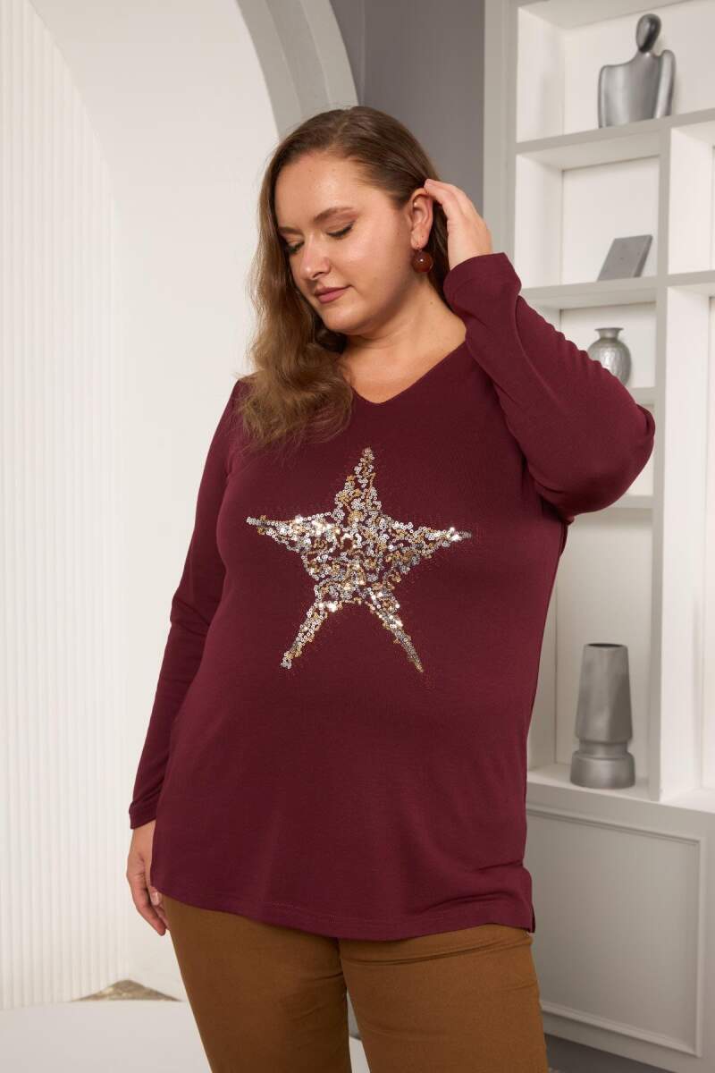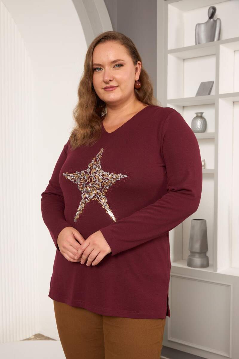 Büyük Beden Yıldız pul payet nakış detay bluz bordo