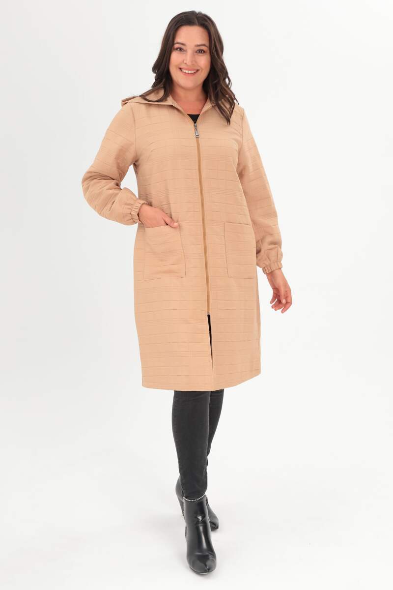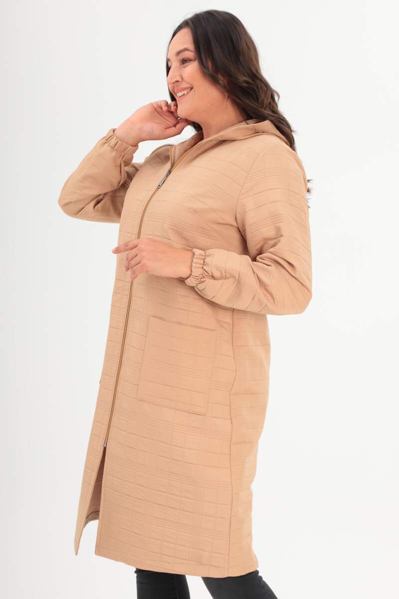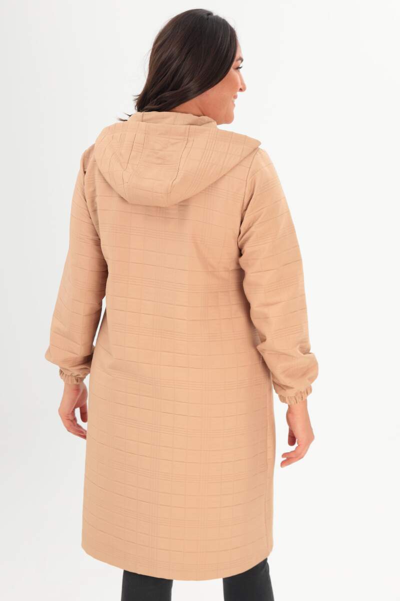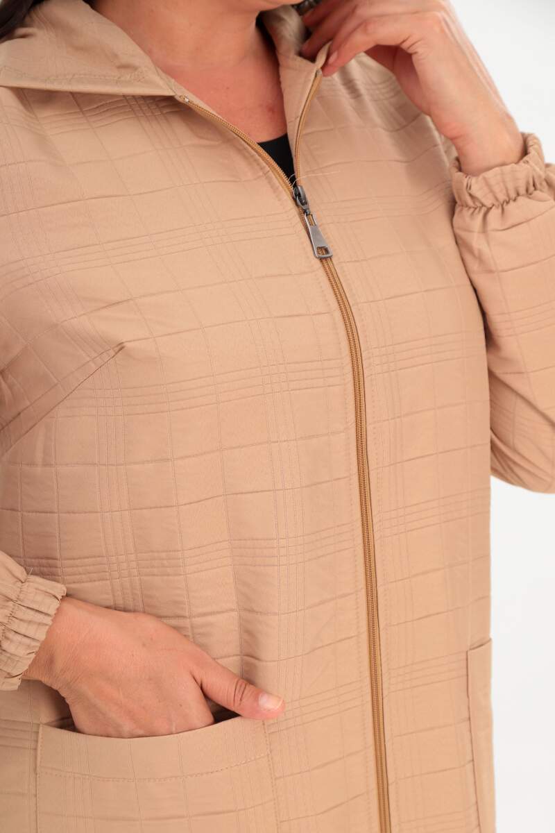 Büyük Kareli Desen Fermuarlı Bej Kap