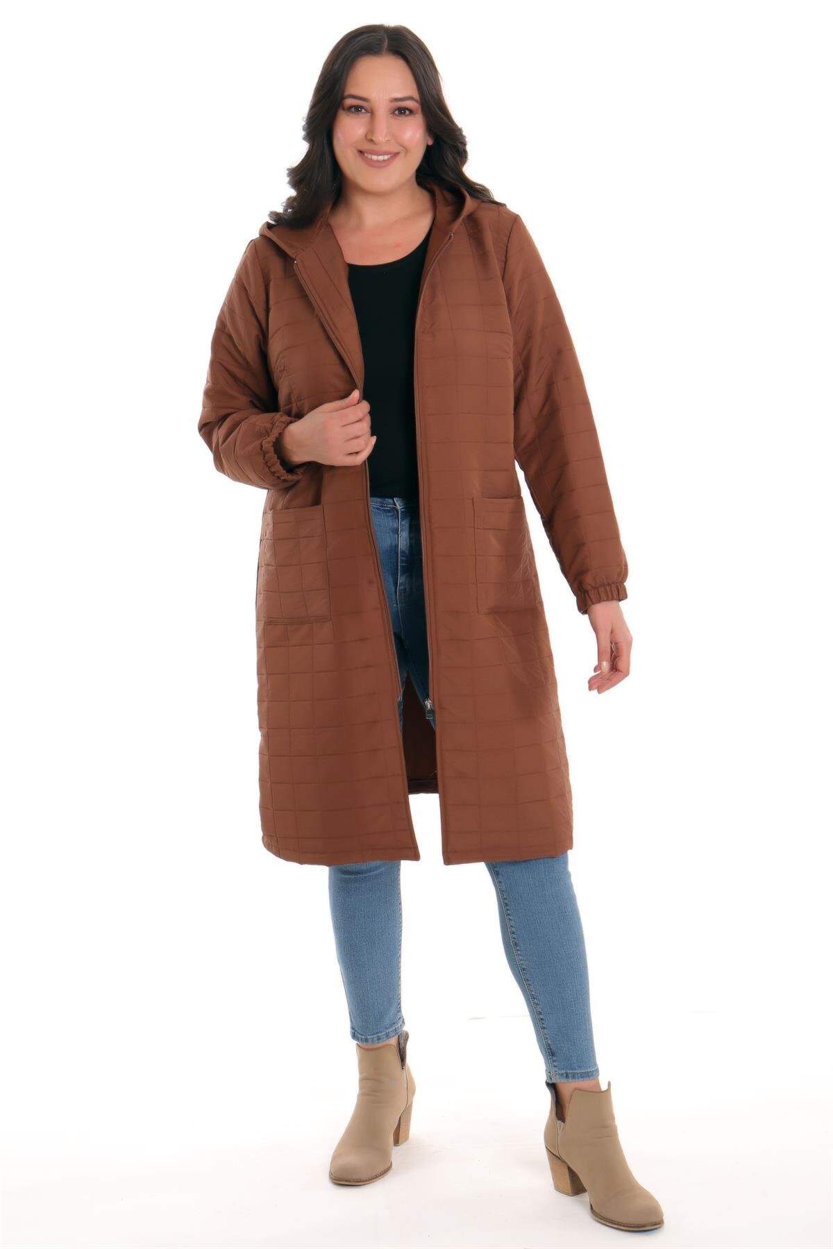 Angelino Büyük Kareli Desen Fermuarlı Kahverengi Kap