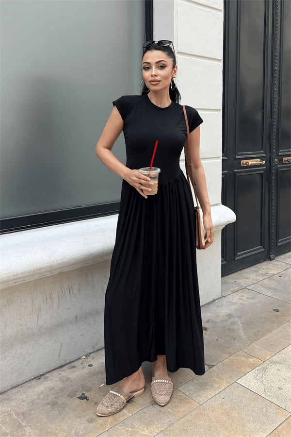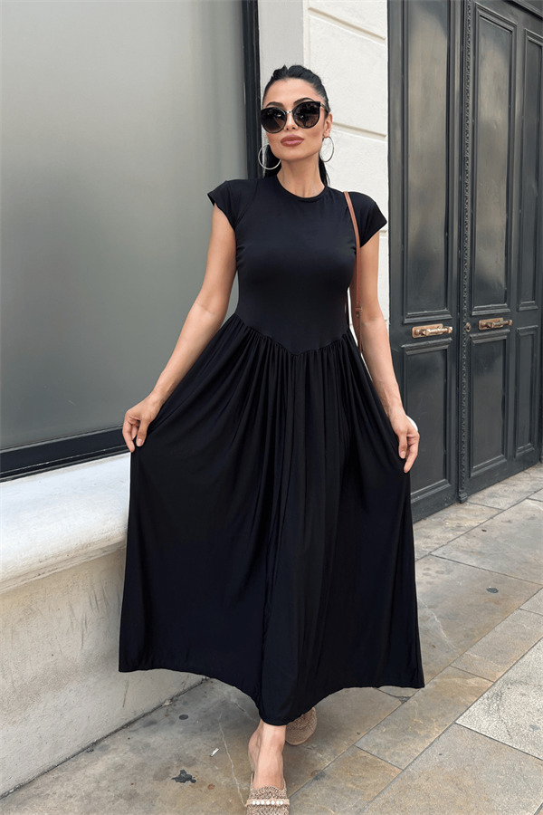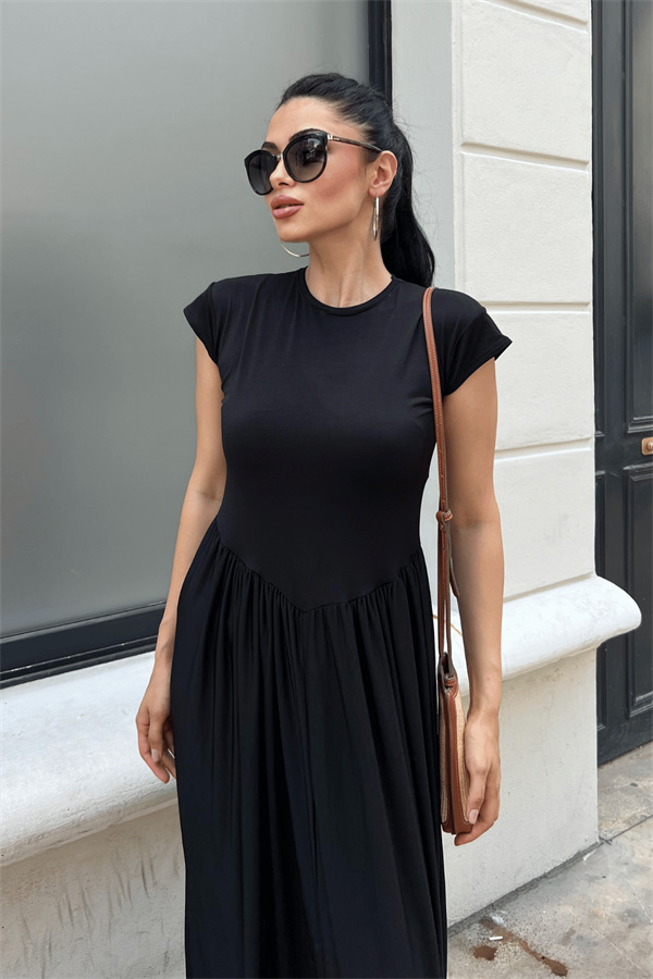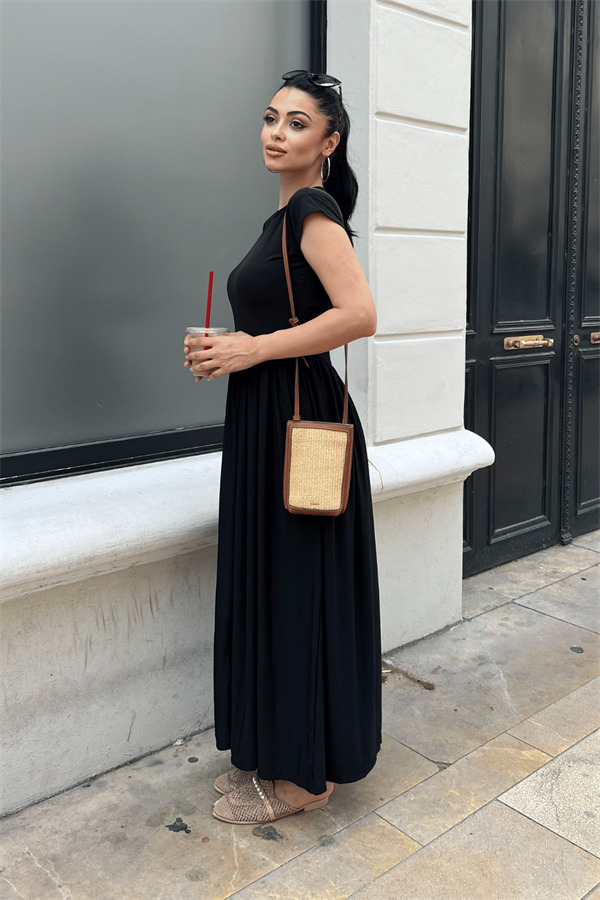 Çelik İnterlok Kumaş Büzgü Detaylı Maxi Elbise - SİYAH