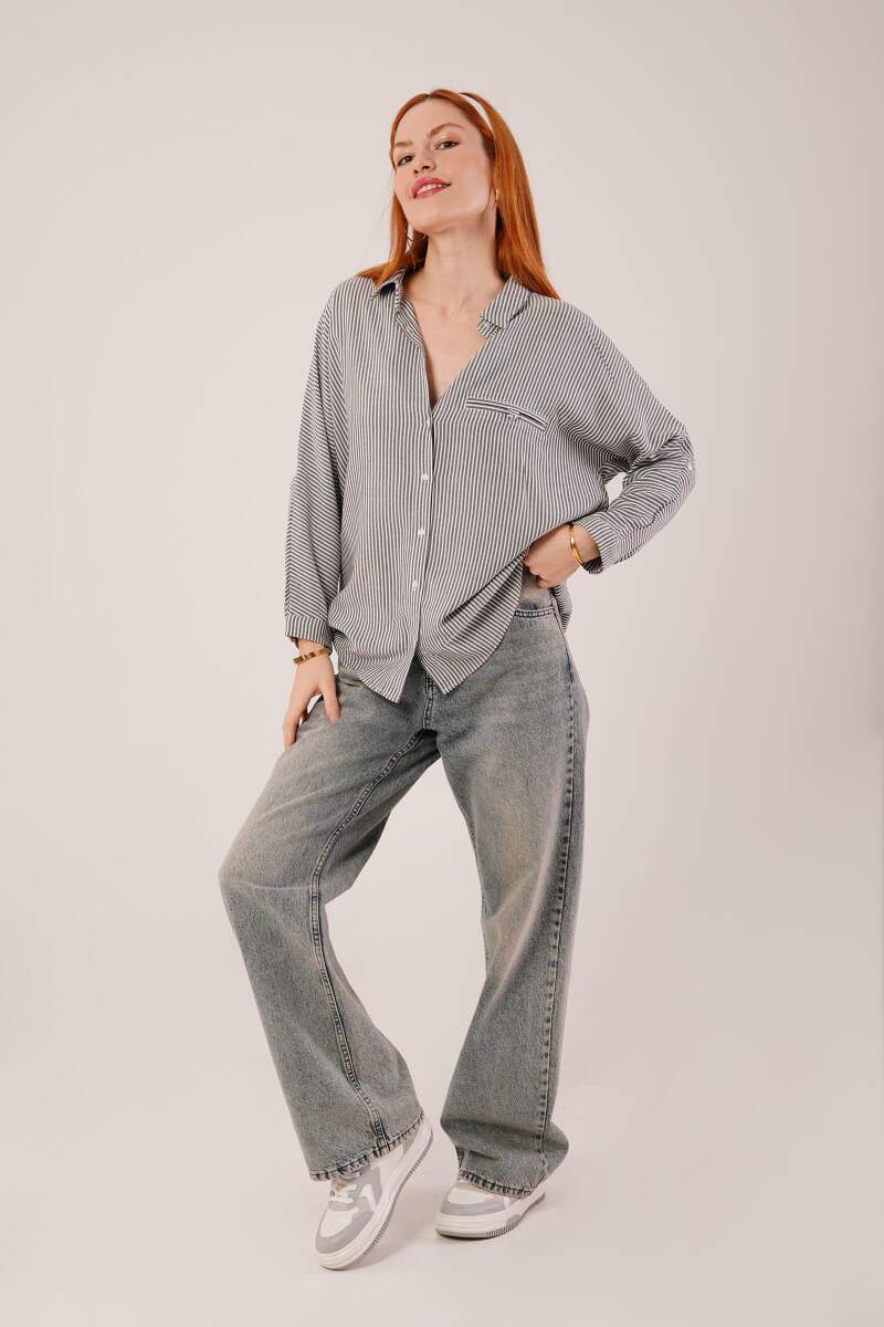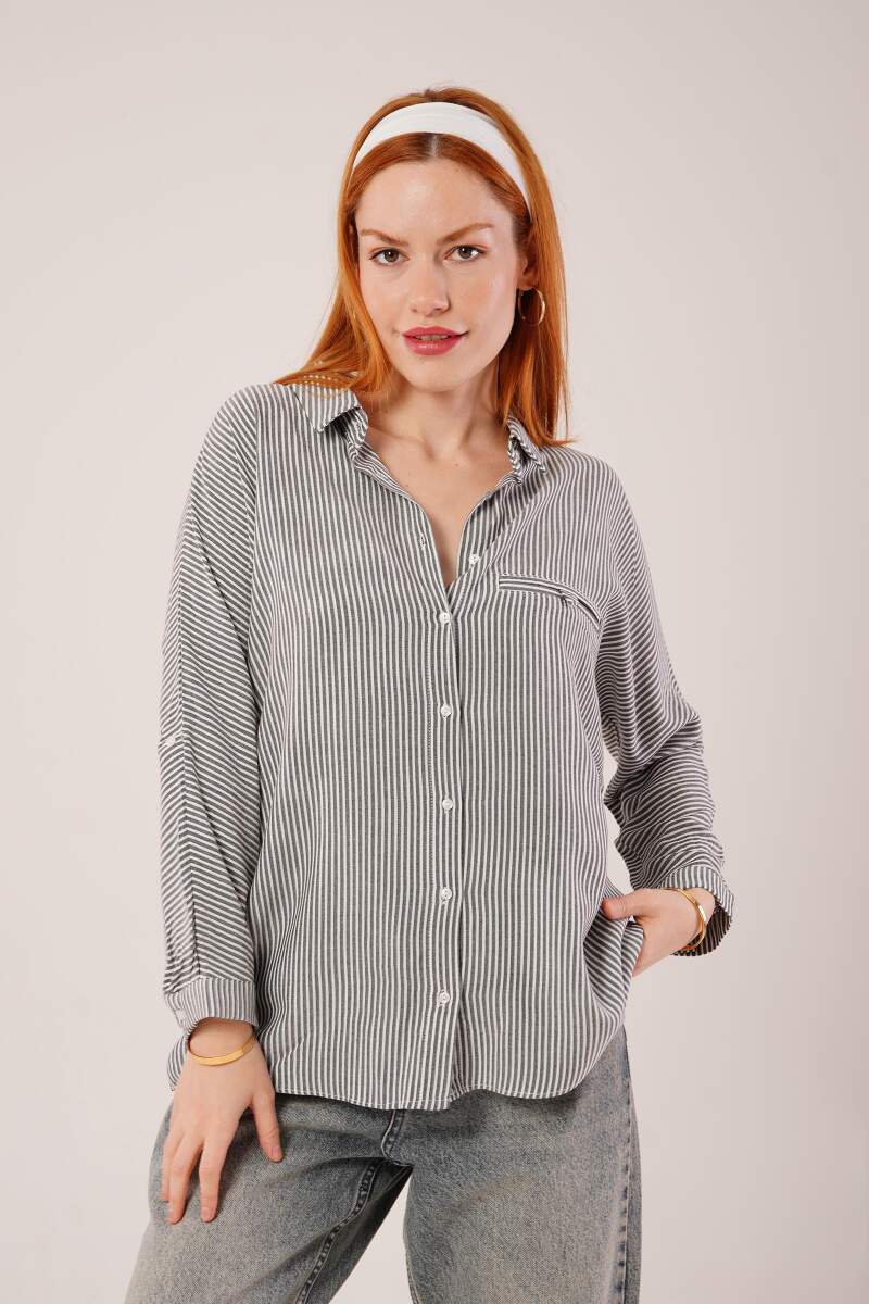 Cep Detay Çizgili Oversize Gri Gömlek