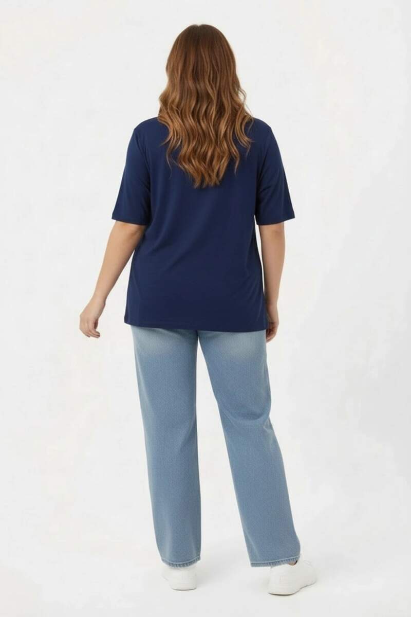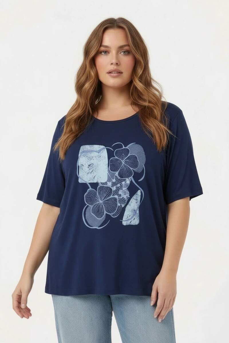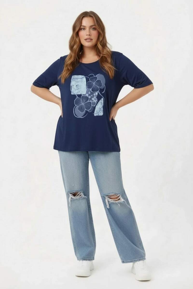 Çiçek Baskılı Kadın Büyük Beden Tişört Lacivert