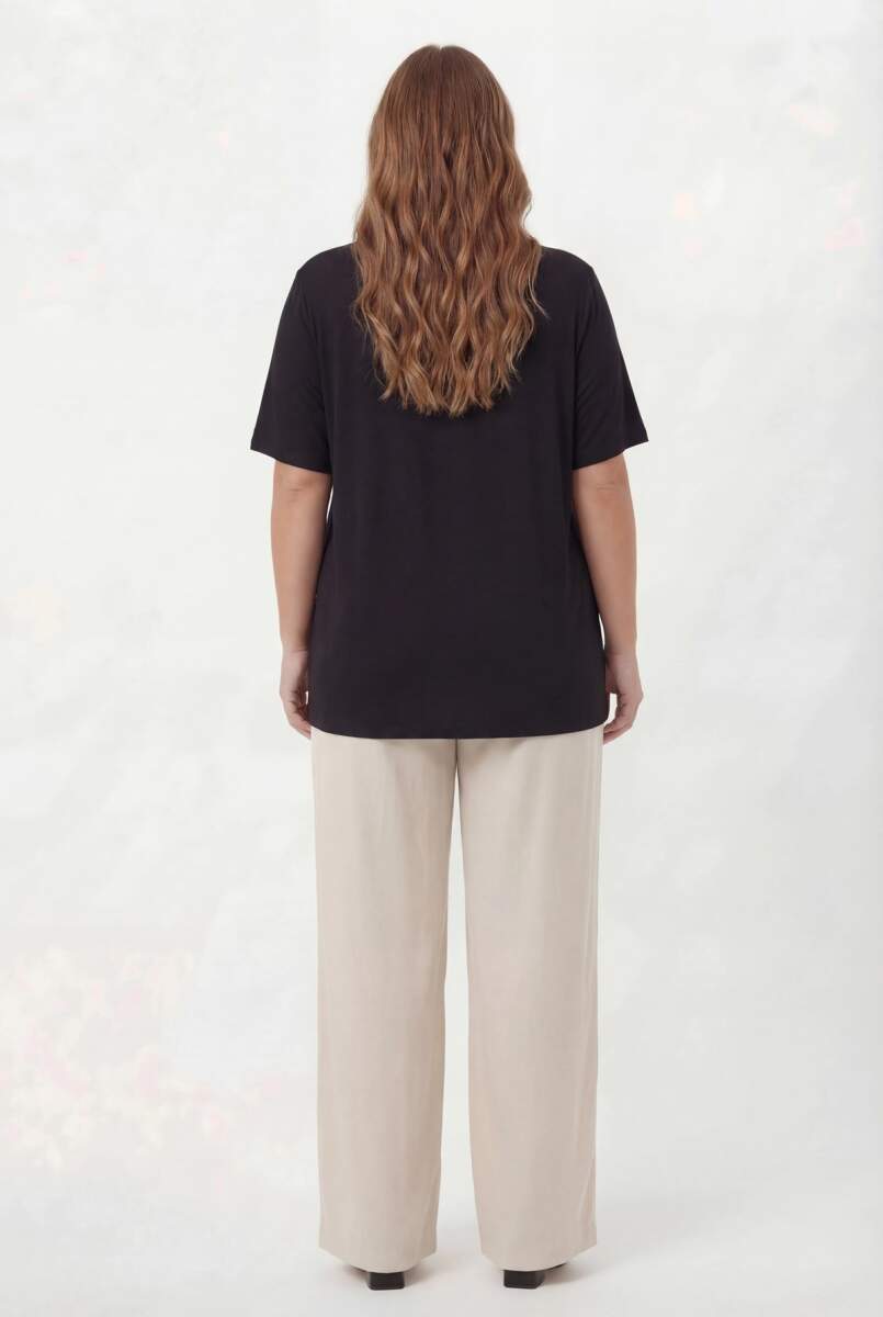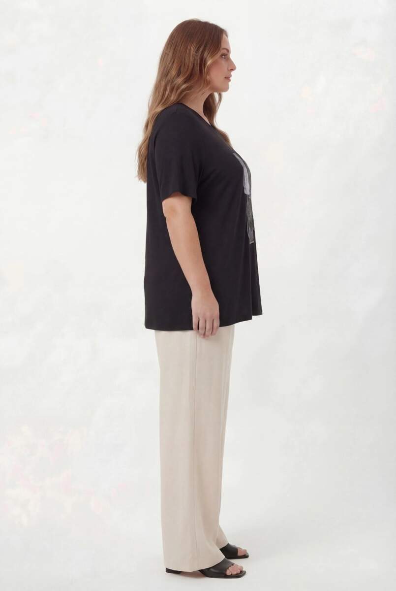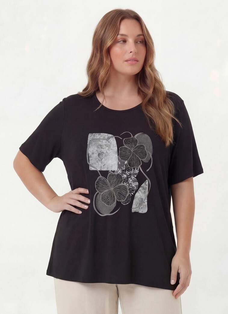 Çiçek Baskılı Kadın Büyük Beden Tişört Siyah