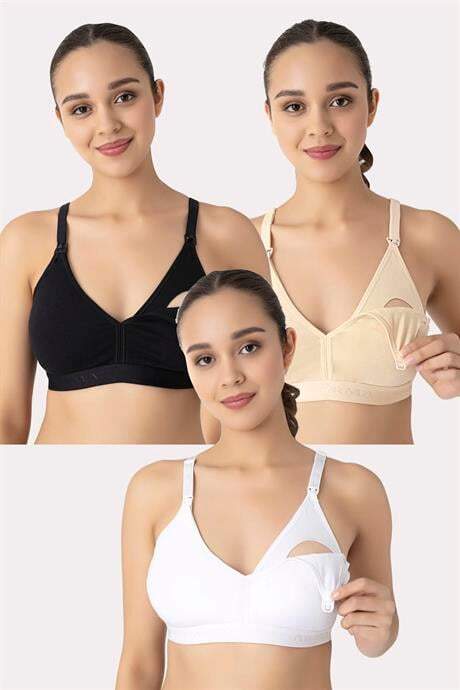 Çıkarılabilir Pedli Emzirme Sütyeni 3'lü Beyaz Siyah Ten Pamuklu Göğüs Ucu Belli Etmez