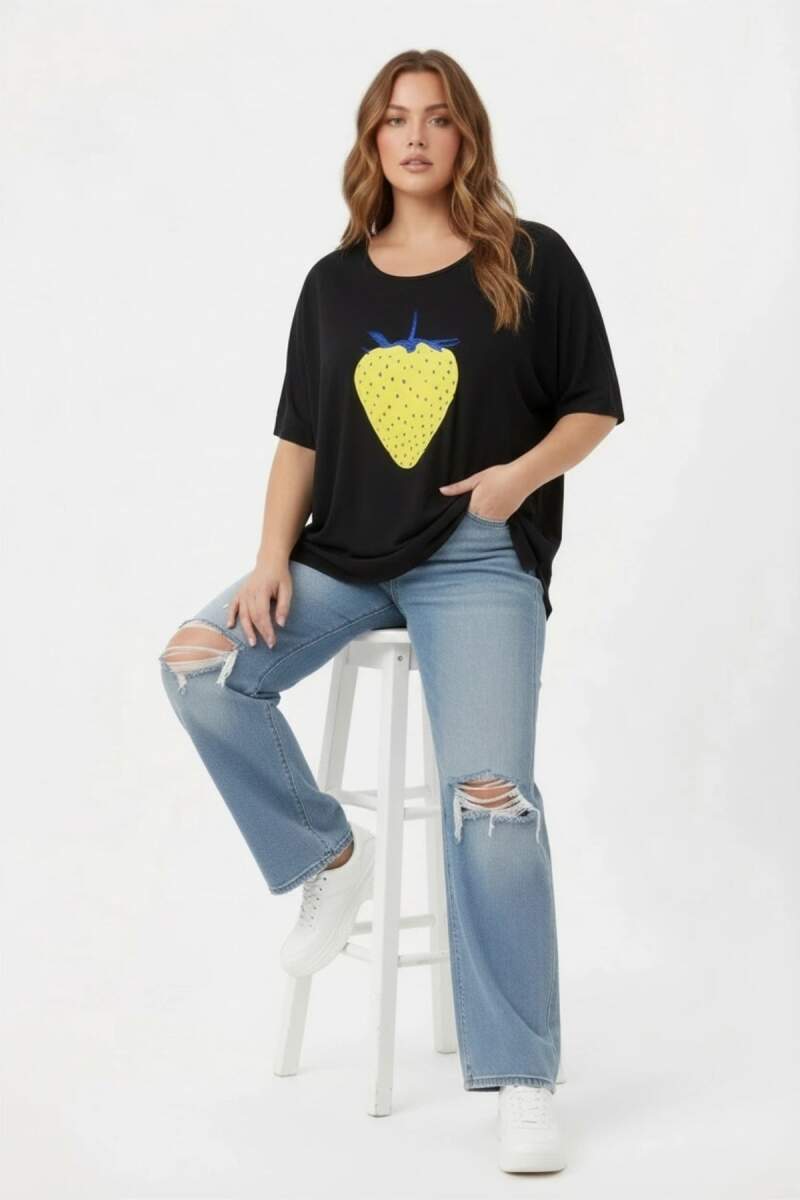 Çilek Desenli Taş İşlemeli Büyük Beden Tişört Siyah