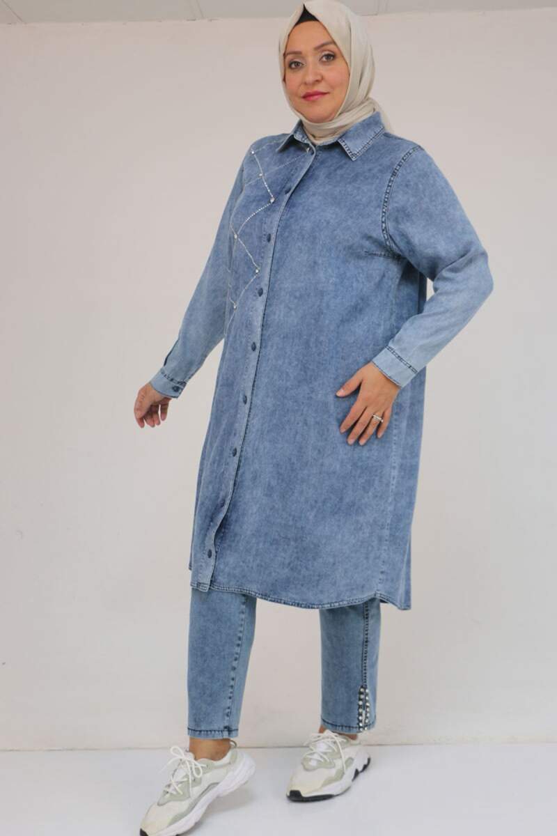 D-58123 Büyük Beden Önü Taş Detaylı Kot Düğmeli Tunik - Lacivert