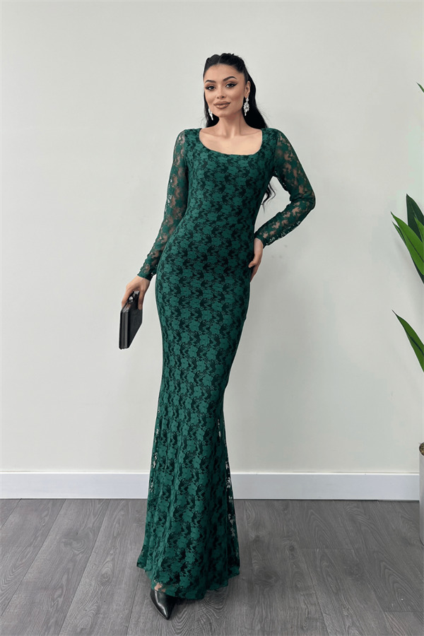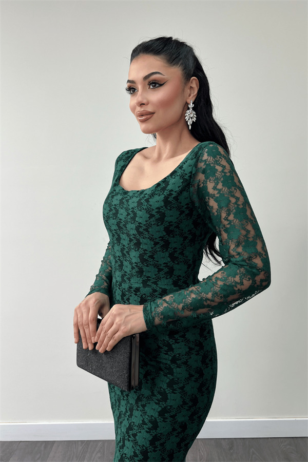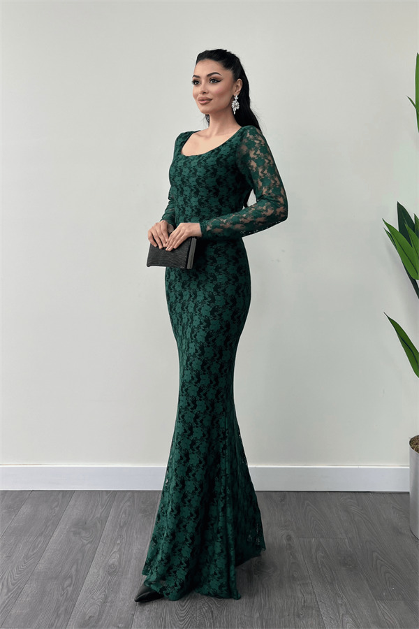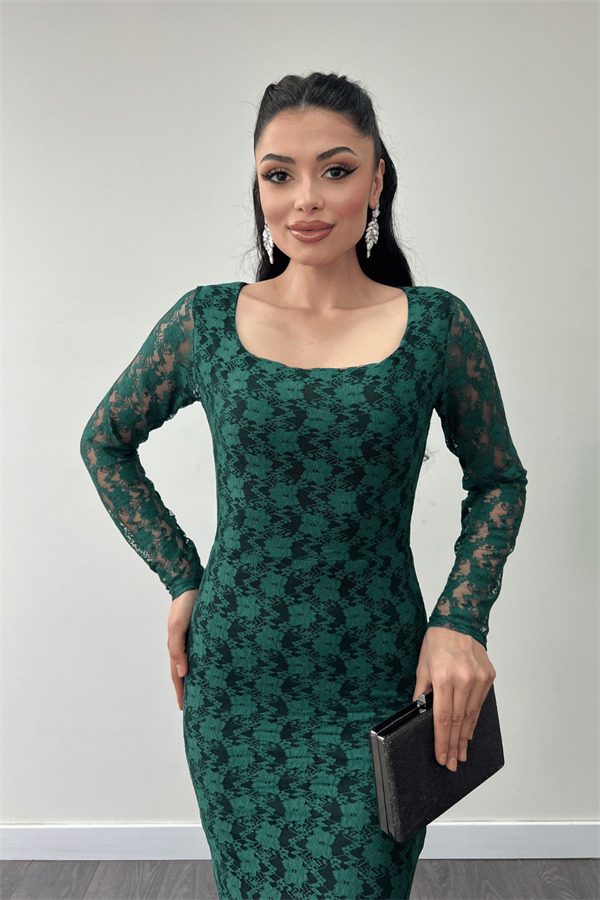 Dantel Kumaş Kare Yaka Balık Elbise - ZÜMRÜT YEŞİL