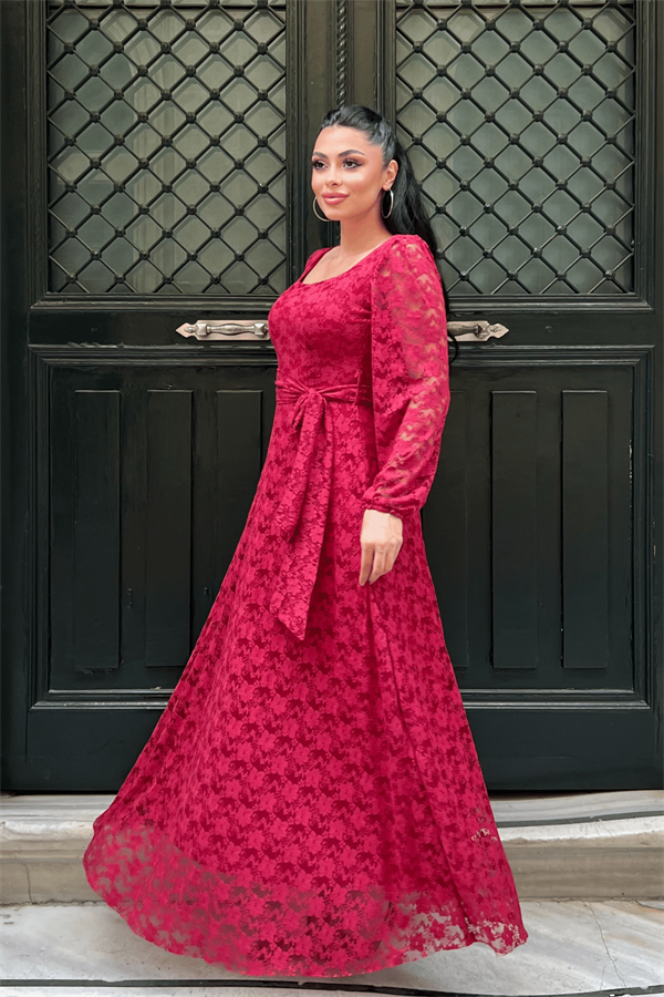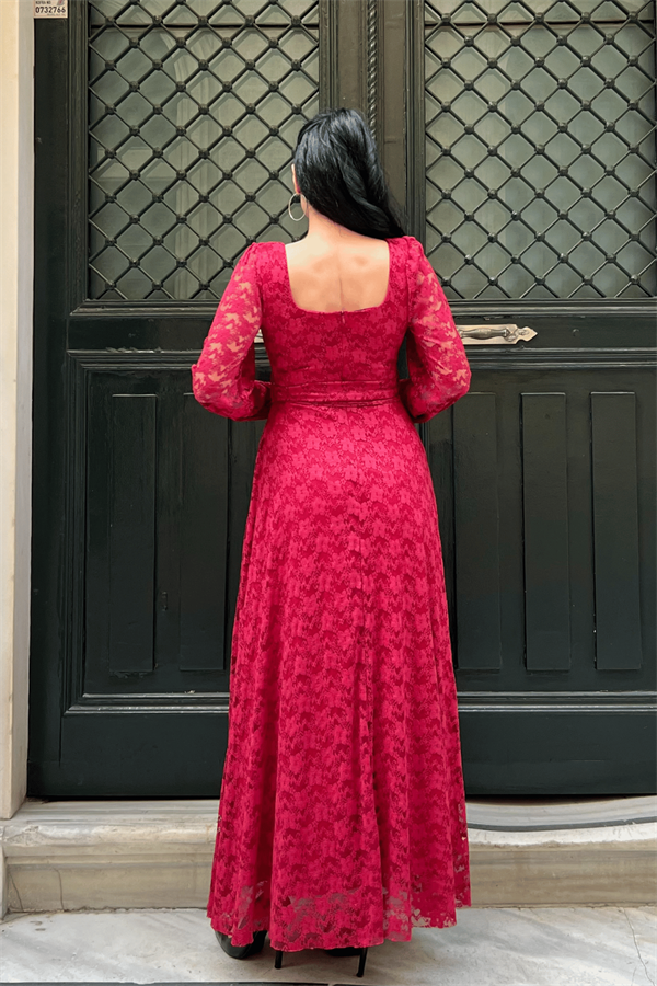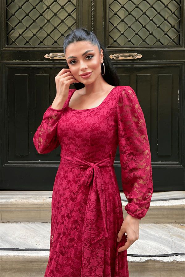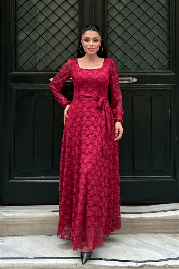 Dantel Kumaş Kare Yaka Elbise - KIRMIZI
