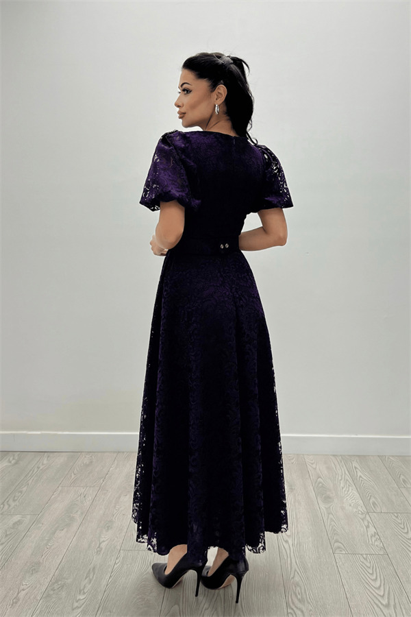 Dantel Kumaş Kolları Balon Kol Maxi Elbise - PATLICAN MOR