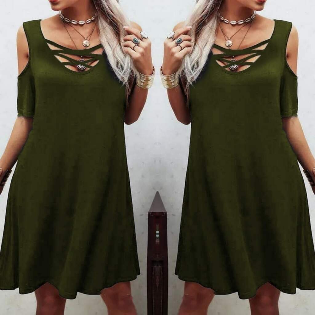 Dekolteli Bağcık Detay Viskon Kumaş Elbise