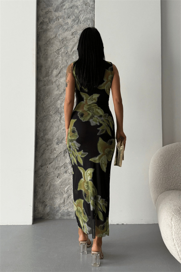 Dijital Baskı Tül Elbise - YEŞİL/SİYAH