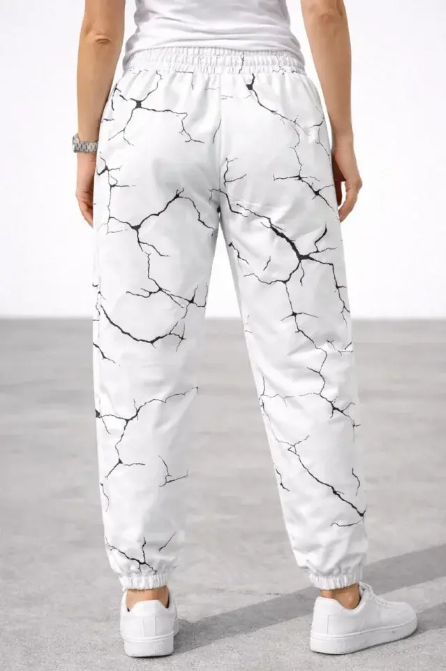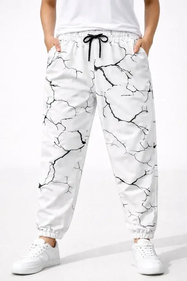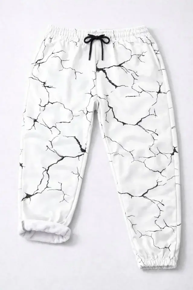 Dijital Baskılı Eşofman Altı Kışlık Üç İplik Şardonlu Kumaş Lastikli Paça, Cepli, Rahat Kalıp - Beyaz