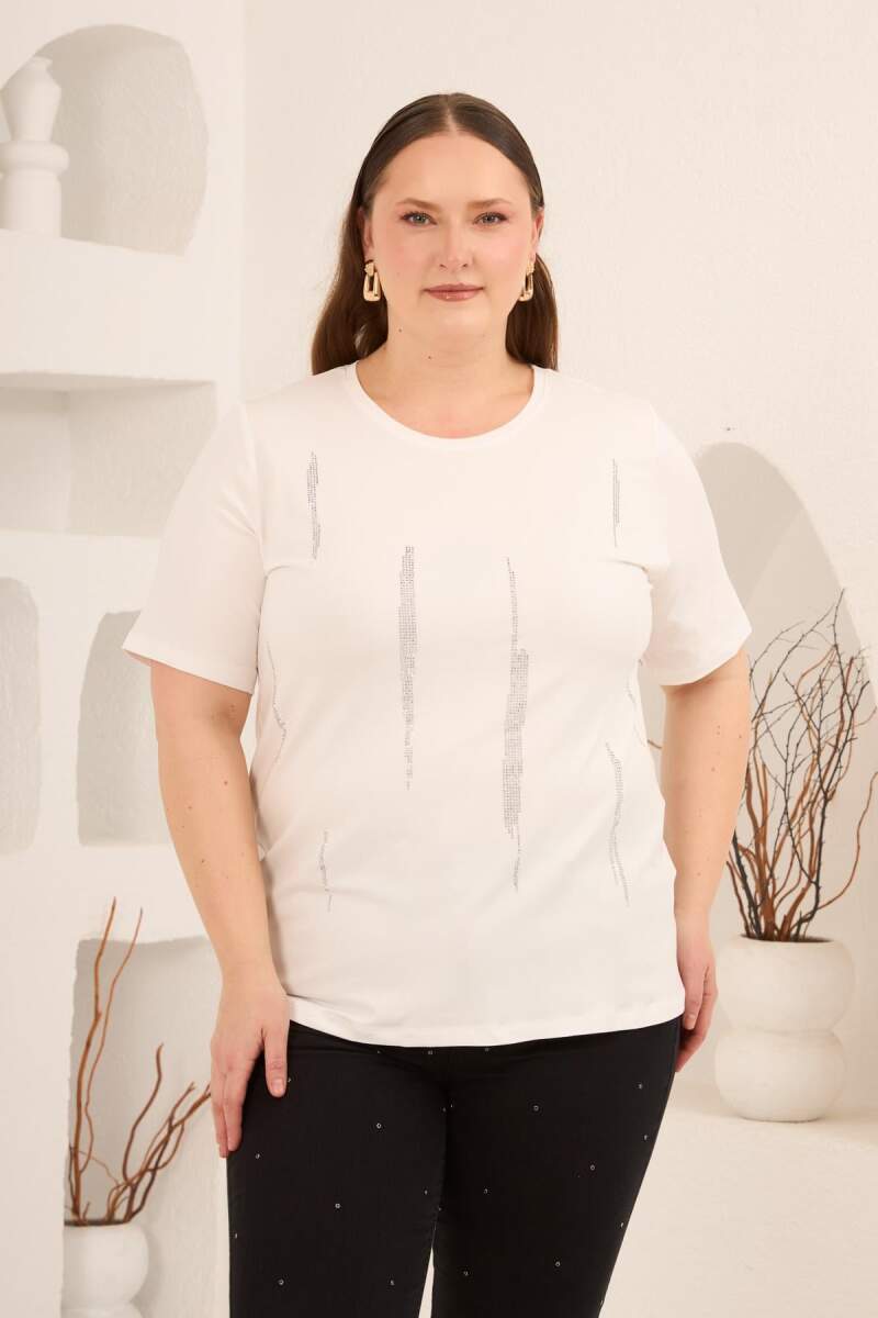 Dikey Taş Baskıl Kadın Büyük Beden Tişört Ekru