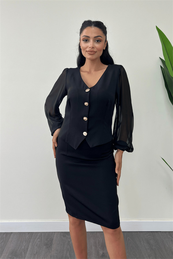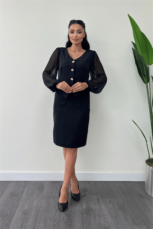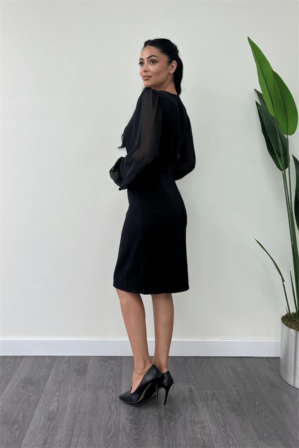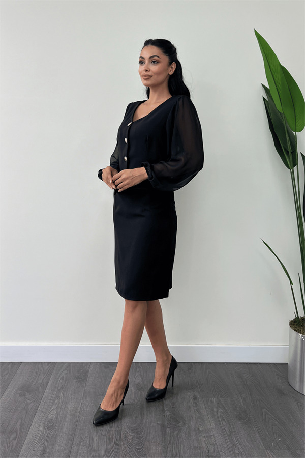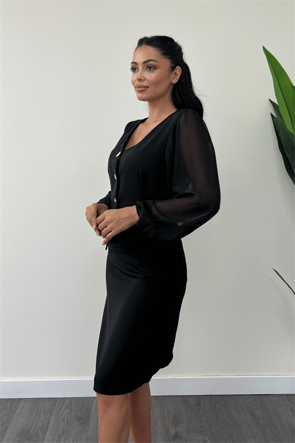 Double Kumaş Düğme Detaylı Kolları Şifon Kalem Elbise - SİYAH
