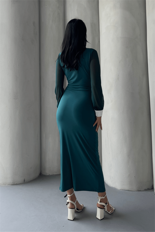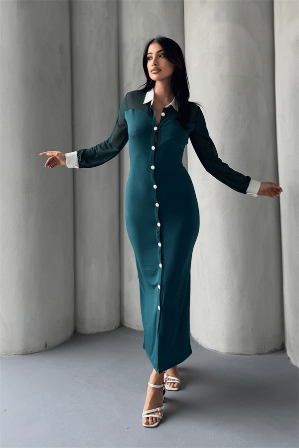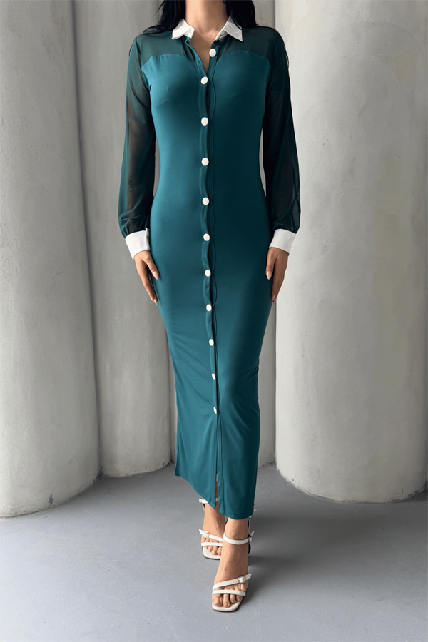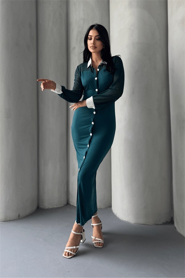 Düğme Detaylı Tül Elbise - ZÜMRÜT YEŞİL