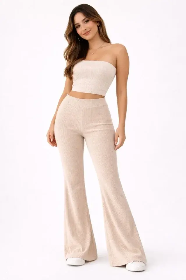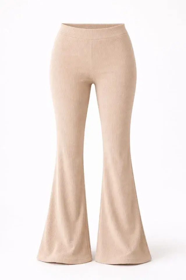 Fitilli Kaşkorse İspanyol Paça Tayt Yüksek Bel Esnek Günlük Rahat Pantolon - Bej
