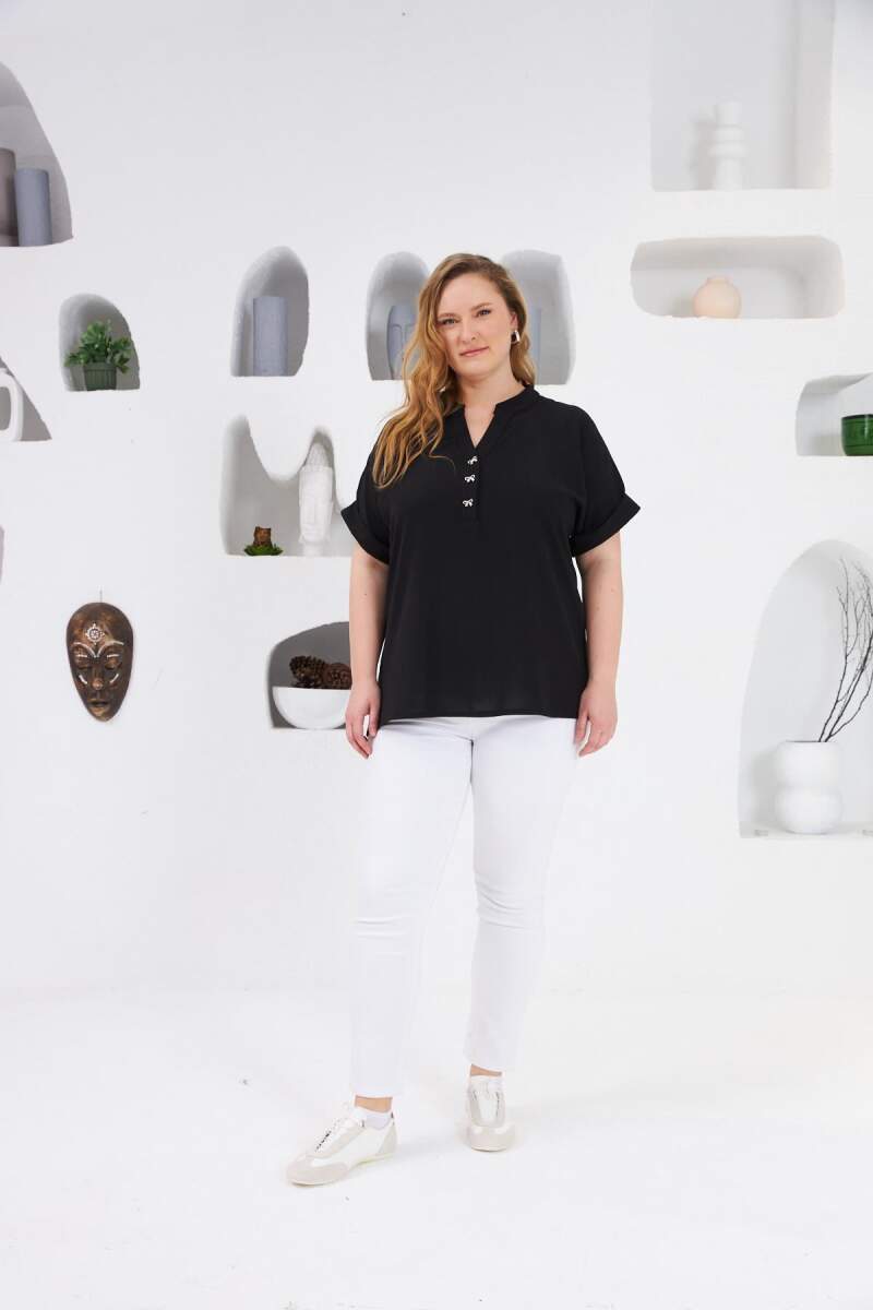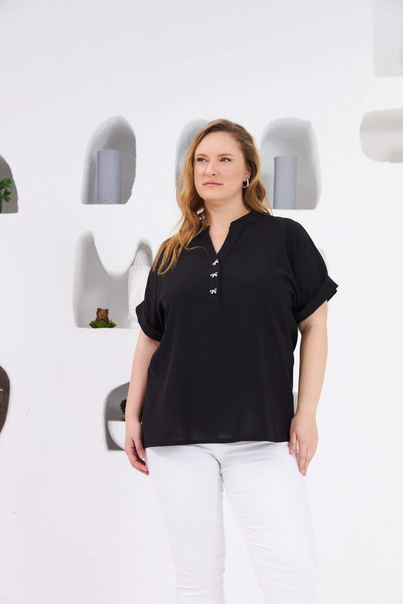Fiyonk düğme detaylı büyük beden siyah bluz, şıklığı ve rahatlığı bir arada sunuyor. %100 polyester kumaşıyla konforlu bir kullanım sağlar.