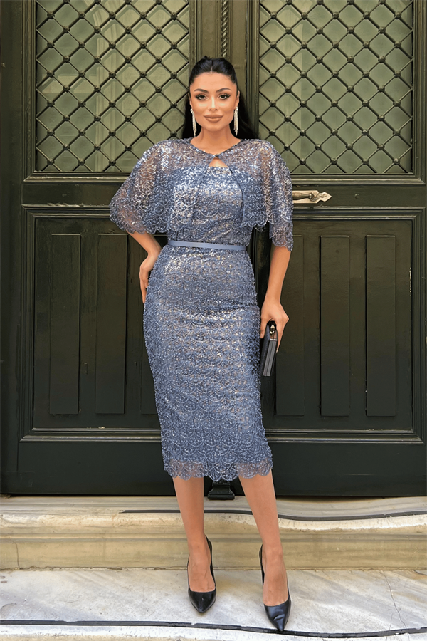 Ful Boncuklu Kumaş Bolero Detaylı Kalem Elbise - İNDİGO MAVİ