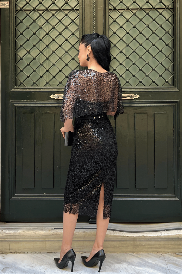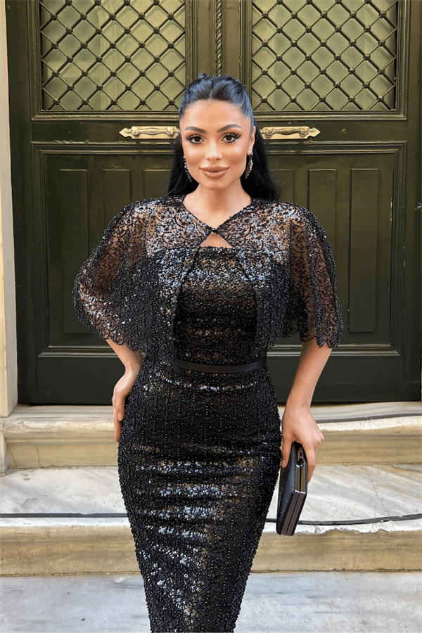 Ful Boncuklu Kumaş Bolero Detaylı Kalem Elbise - SİYAH