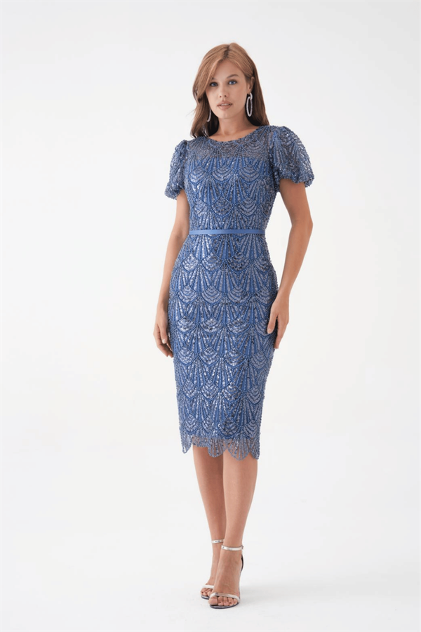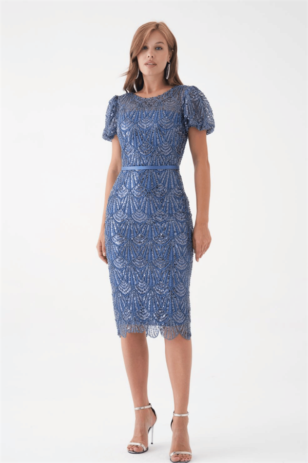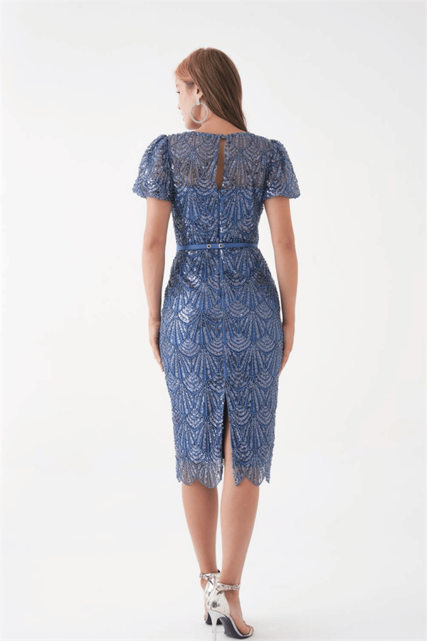 Full Boncuklu Kalem Elbise - İNDİGO MAVİ