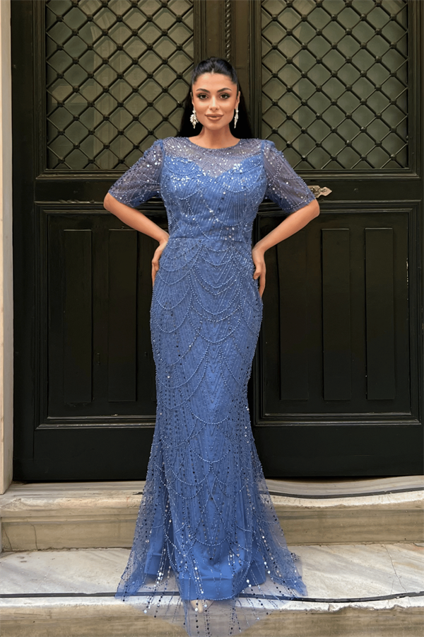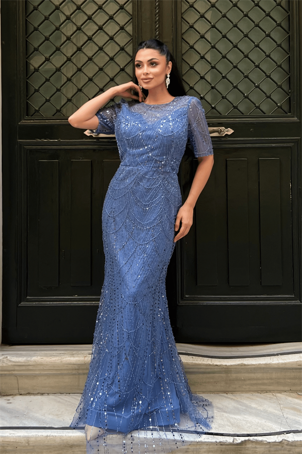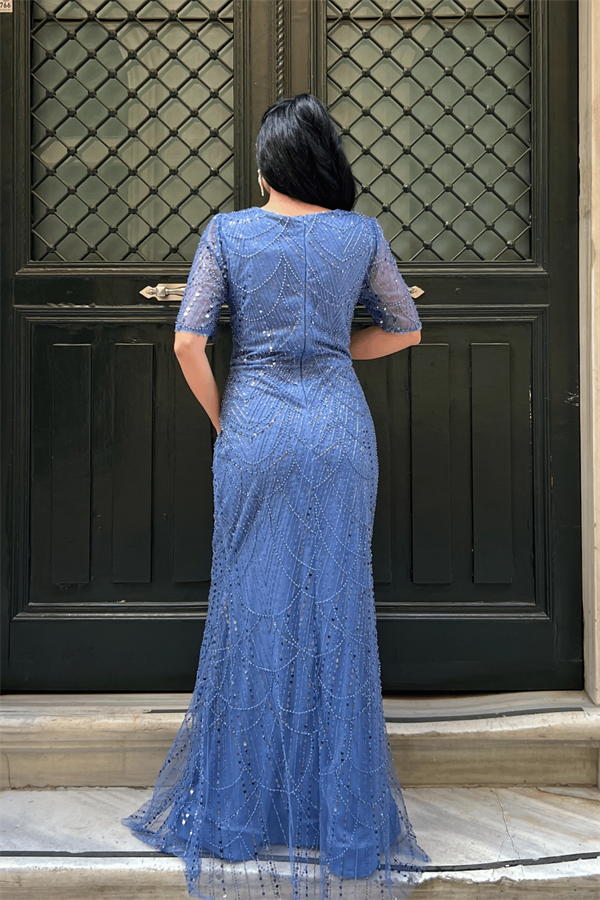 Full Boncuklu Kumaş Tasarım Elbise - İNDİGO MAVİ