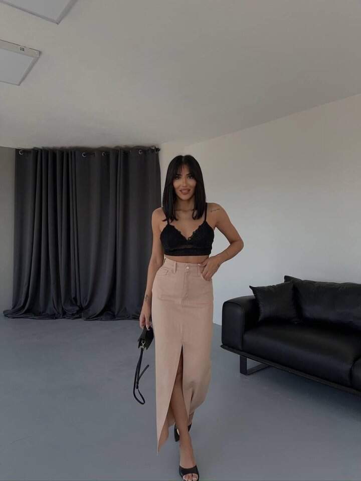 GABARDİN UZUN ÖNDEN YIRTMAÇLI ETEK - Kahverengi