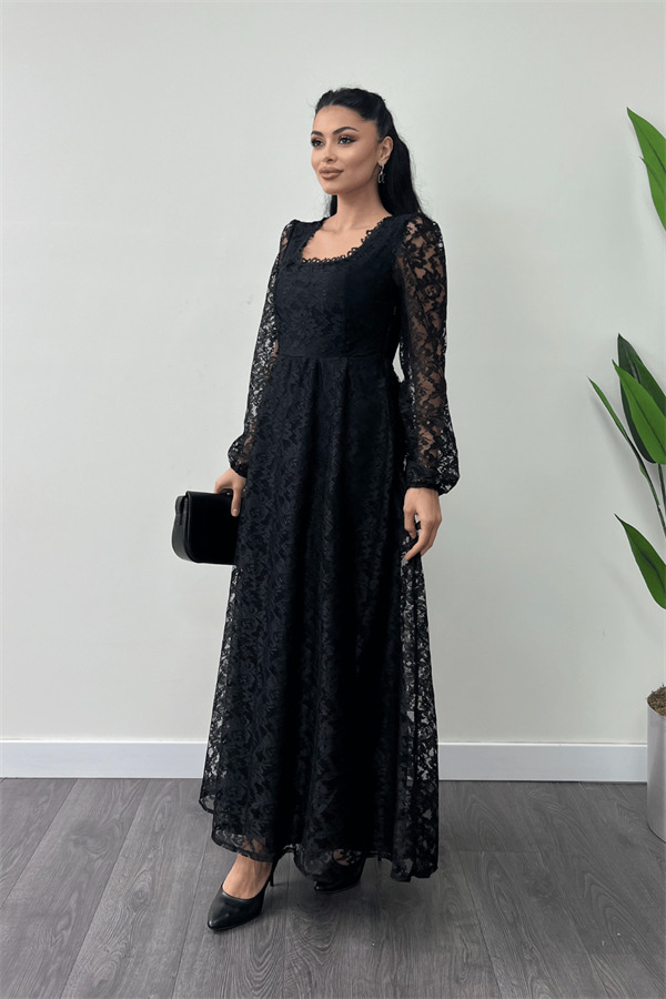 Güpür Dantel Kumaş Kare Yaka Elbise - SİYAH