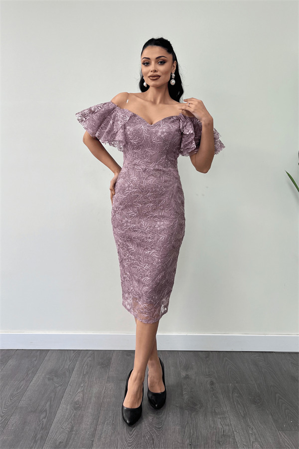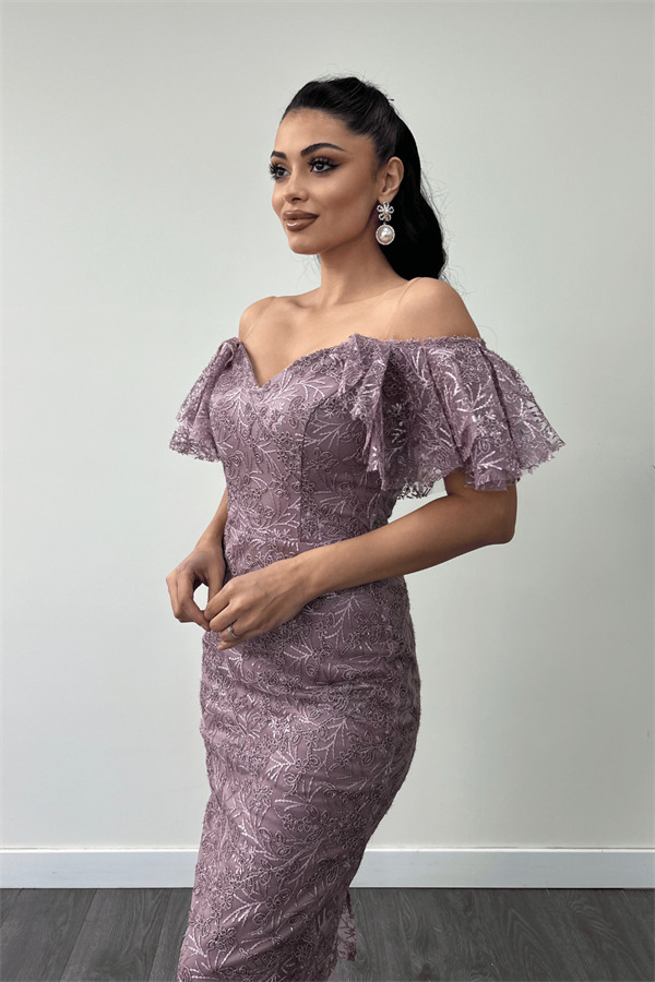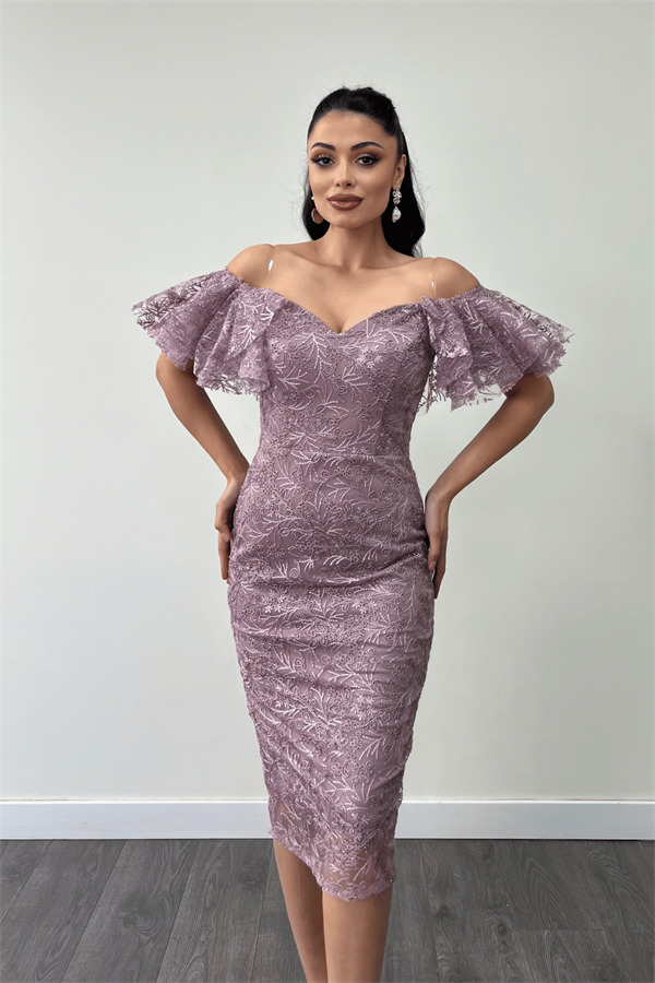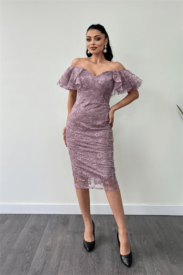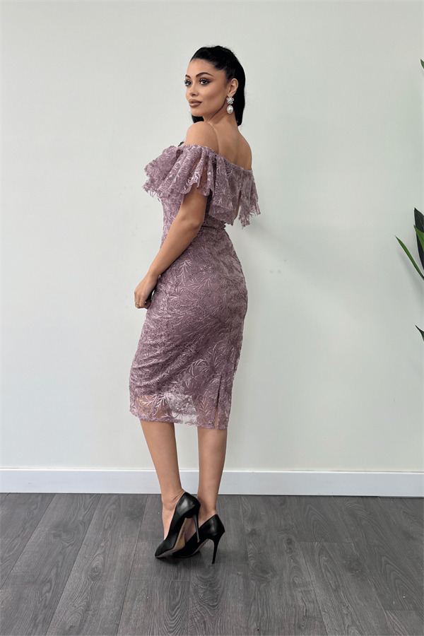 İşleme Dantel Kumaş Kayık Yaka Kalem Elbise - GÜL KURUSU