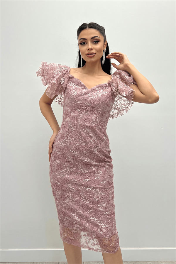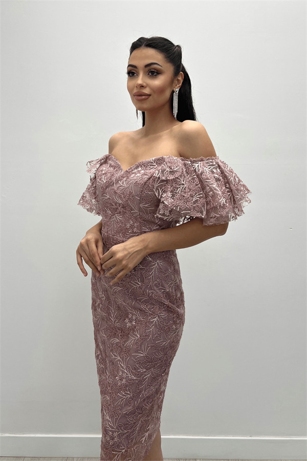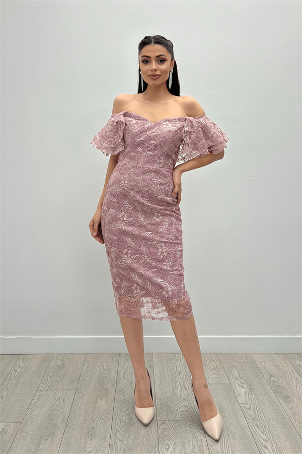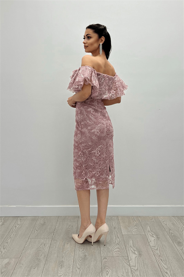 İşleme Dantel Kumaş Kayık Yaka Kalem Elbise - PUDRA