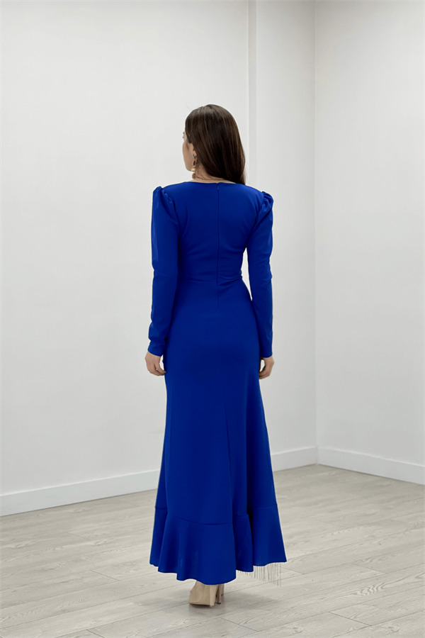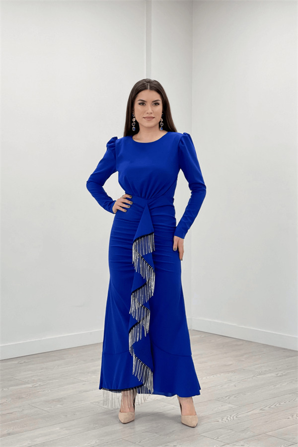 İthal Krep Kumaş Taş Püskül Detaylı Abiye Elbise - SAKS MAVİ