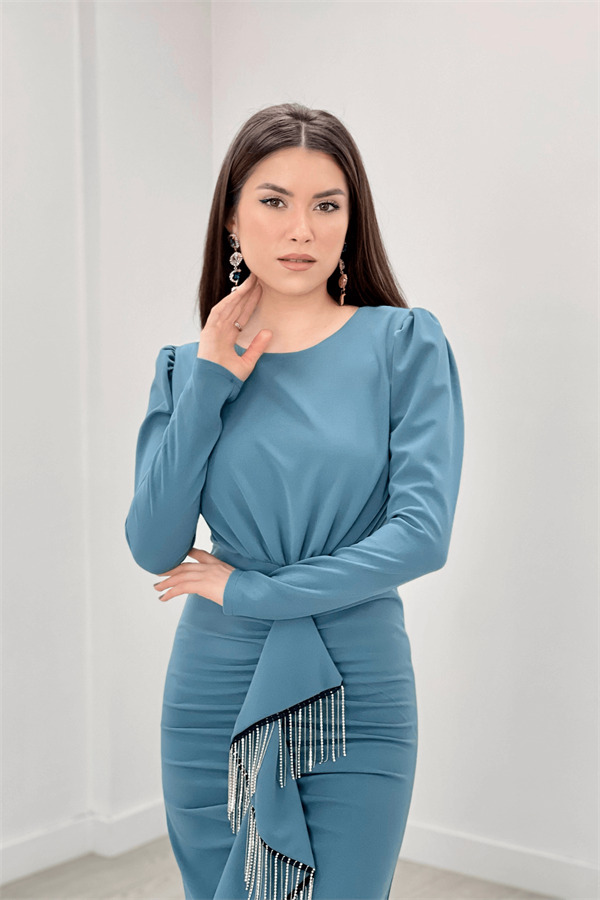 İthal Krep Kumaş Taş Püskül Detaylı Abiye Elbise - SU YEŞİLİ