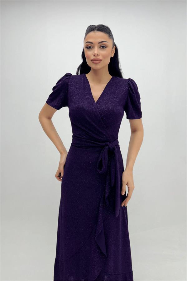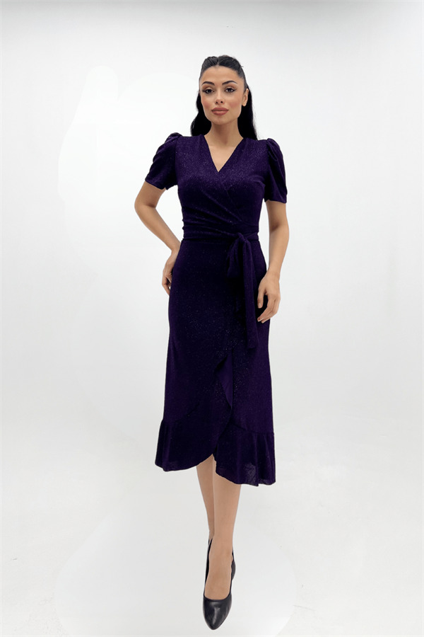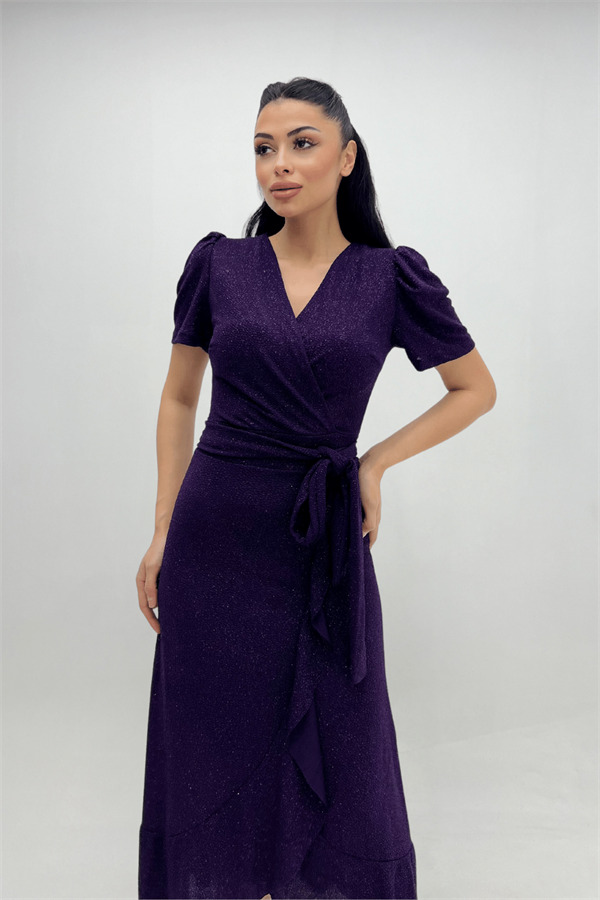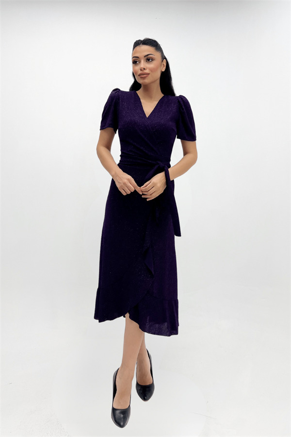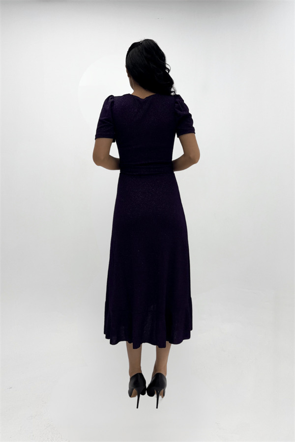 İthal Simli Kumaş Kuşak Detaylı Midiboy Elbise - PATLICAN MOR