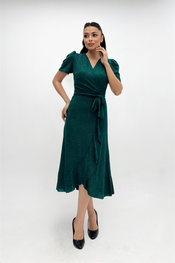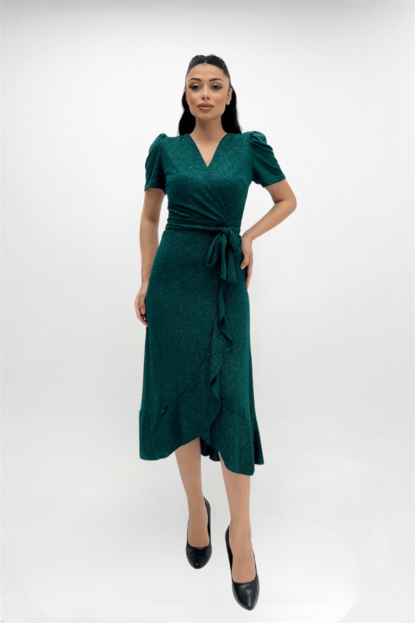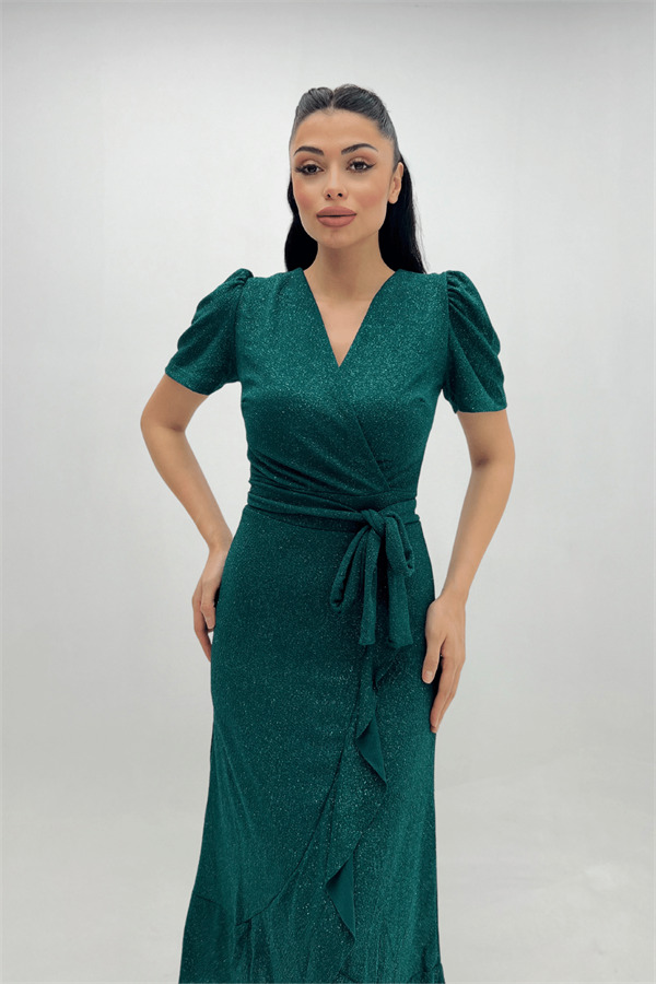 İthal Simli Kumaş Kuşak Detaylı Midiboy Elbise - ZÜMRÜT YEŞİL