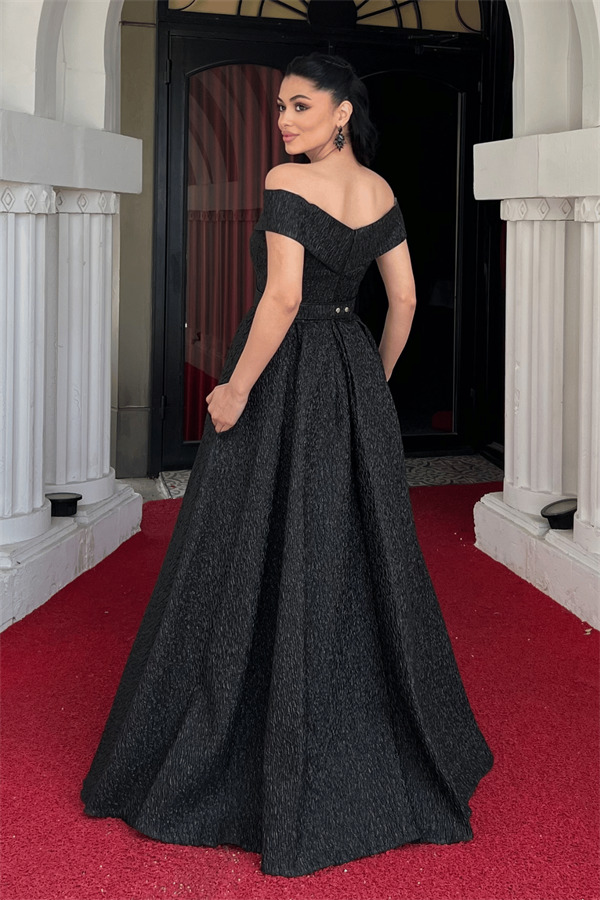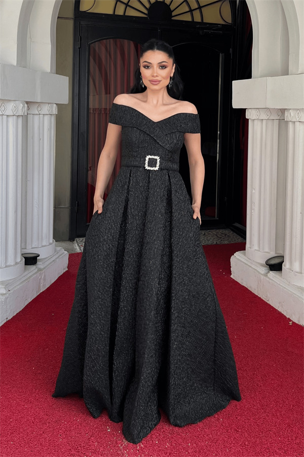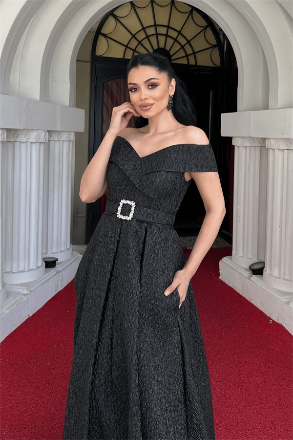 Jakar Kumaş Kayık Kaya Prenses Elbise - SİYAH