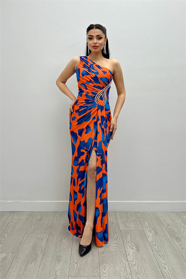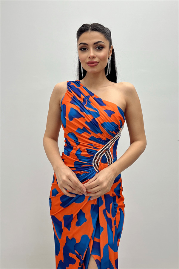 Jarse Kumaş Drapeli Taş Detaylı Balık Elbise - TURUNCU