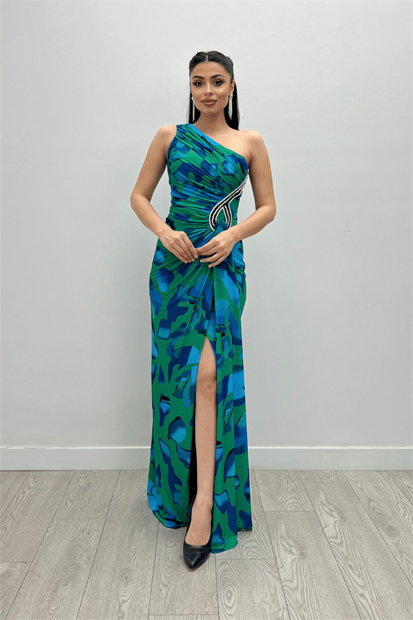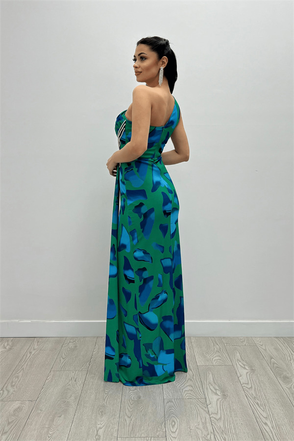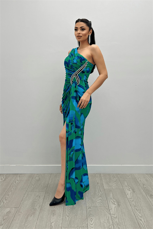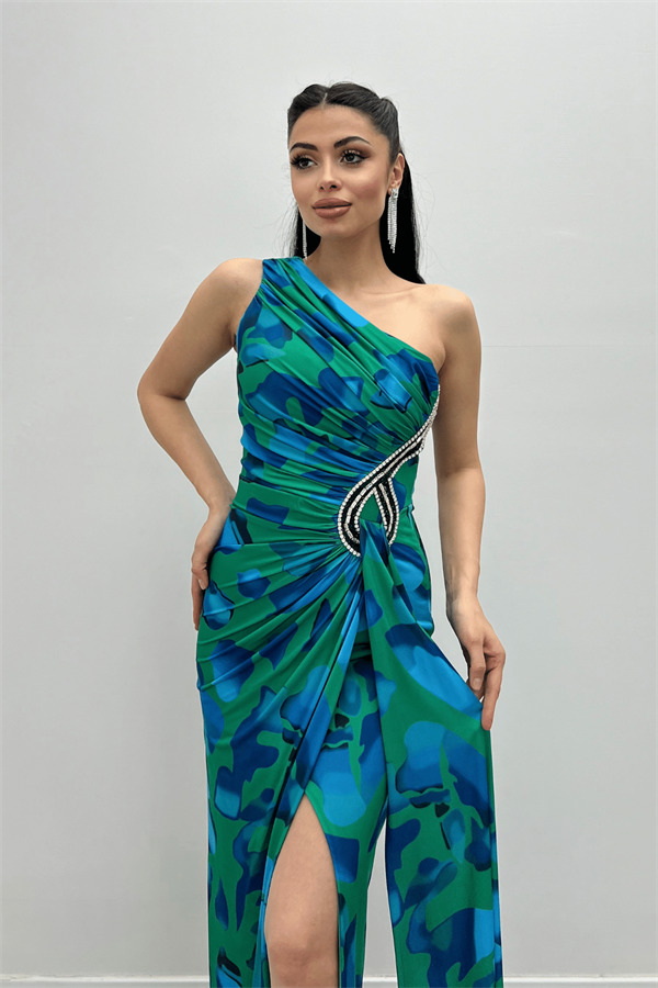 Jarse Kumaş Drapeli Taş Detaylı Balık Elbise - YEŞİL