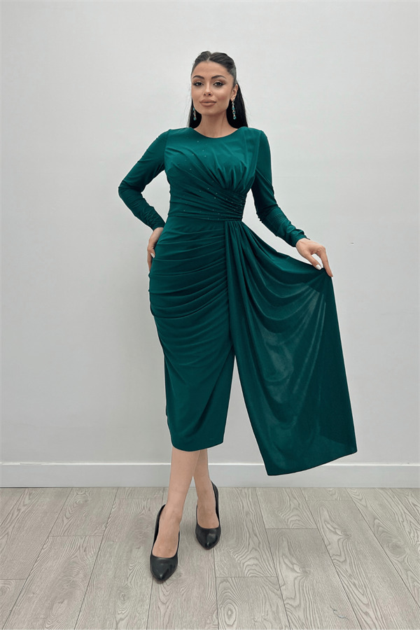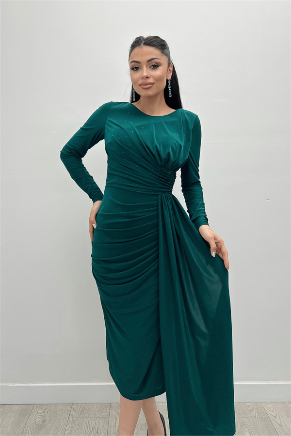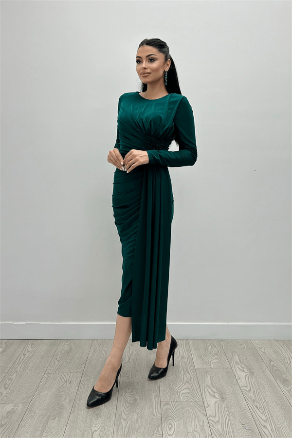 Jarse Kumaş Drapeli Taş Detaylı Elbise - ZÜMRÜT YEŞİL
