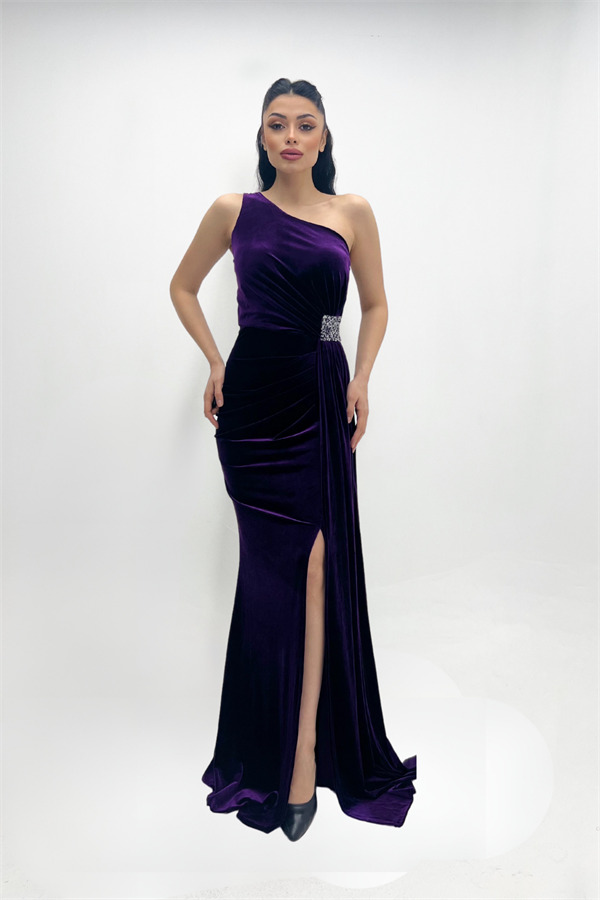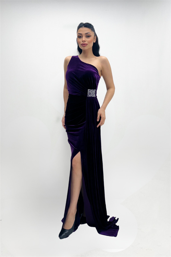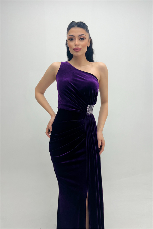 Kadife Kumaş Büzgülü Şal Detaylı Abiye Elbise - MOR