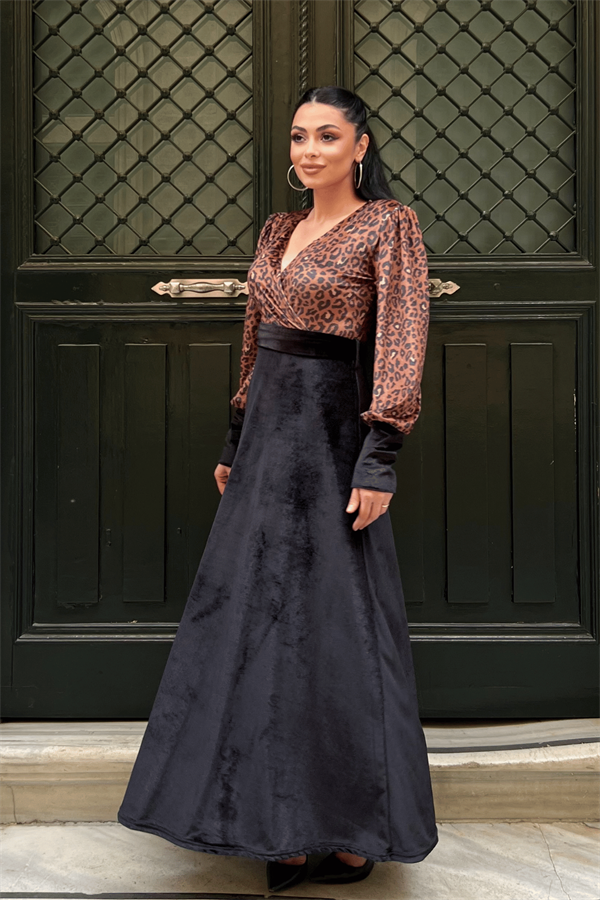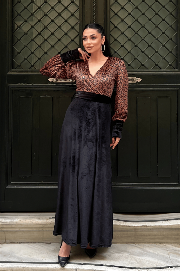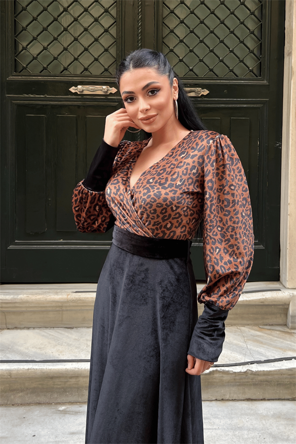Kadife Kumaş Leopar Detaylı Elbise - SİYAH