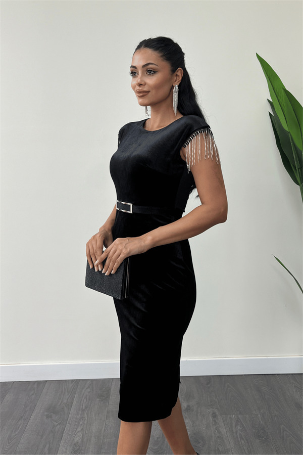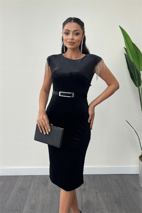 Kadife Kumaş Omuz Püsküllü Kalem Elbise
