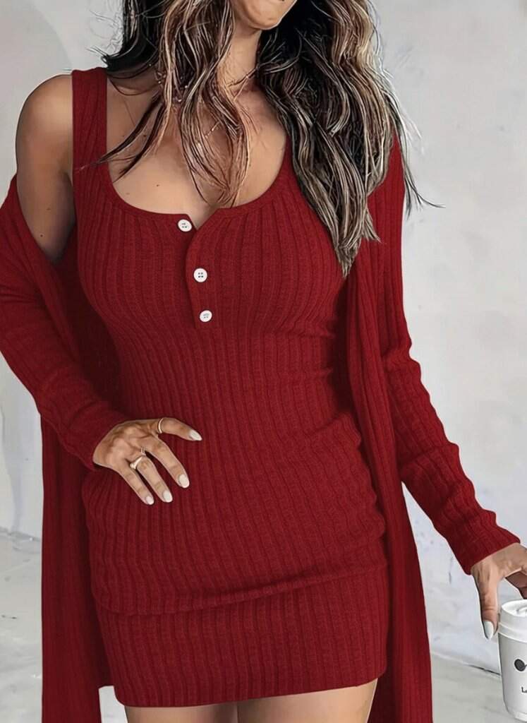 Kadın Askılı Yuvarlak Yakalı önü Düğmeli şardonlu Kaşkorse Mini Elbise Ve Kısa Ceket