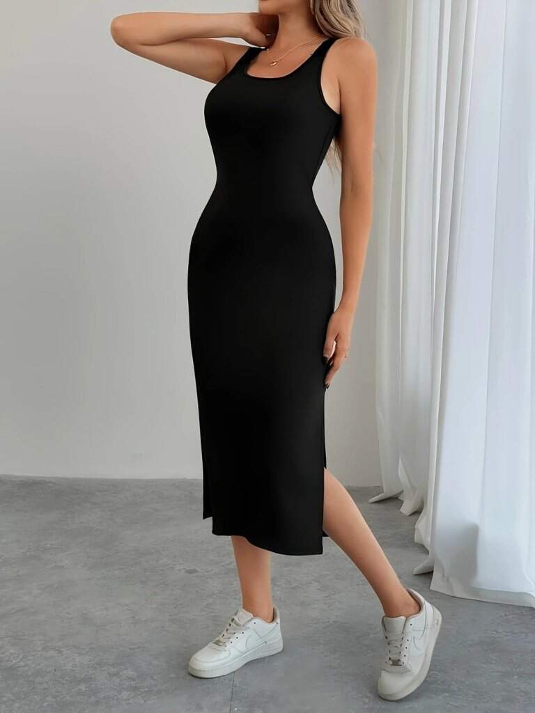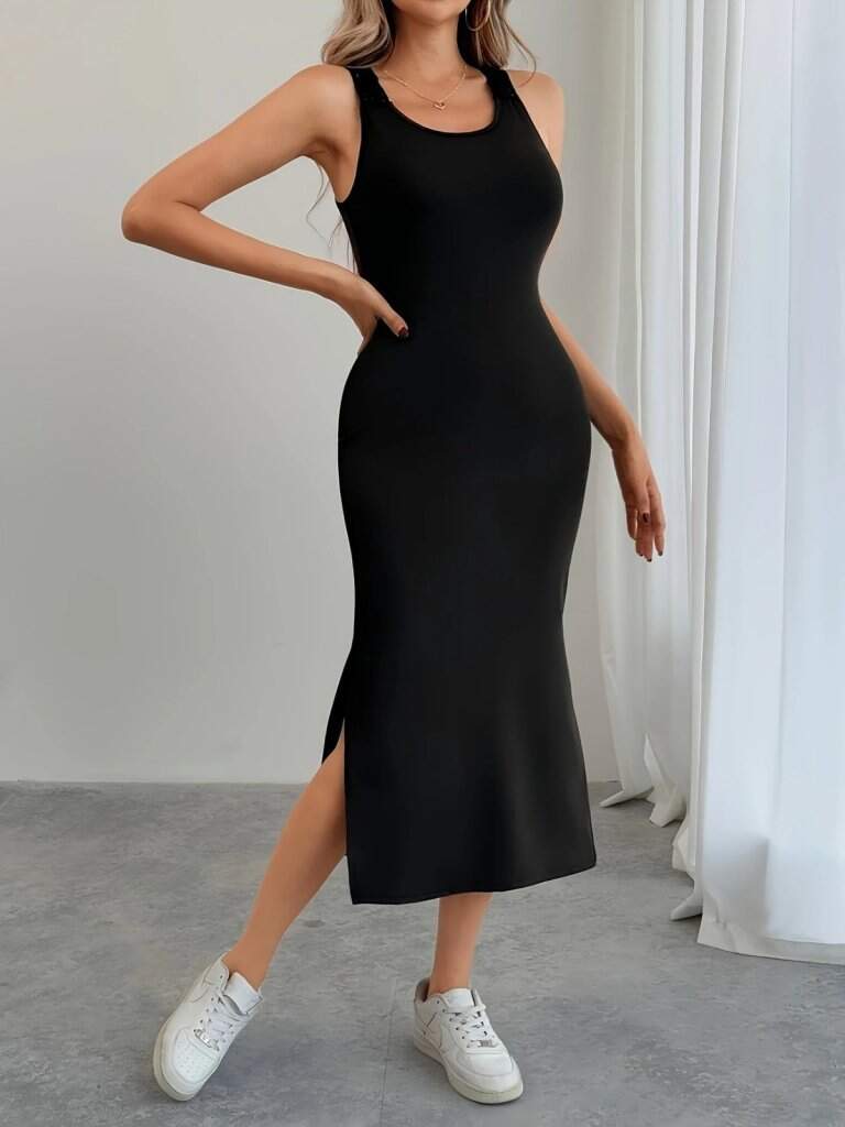 Kadın Askılı Yuvarlak Yakalı Yandan Yırtmaçlı Arkası Dantel Detaylı Viskon Elbise