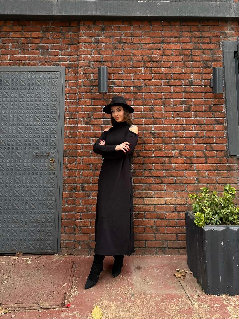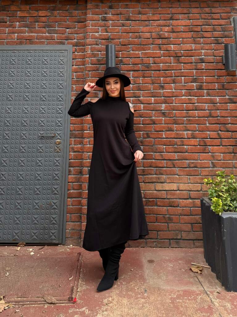 Kadın Balıkçı Yaka Omuzlardan Açık Uzun Kollu Janjan Krep Elbise
