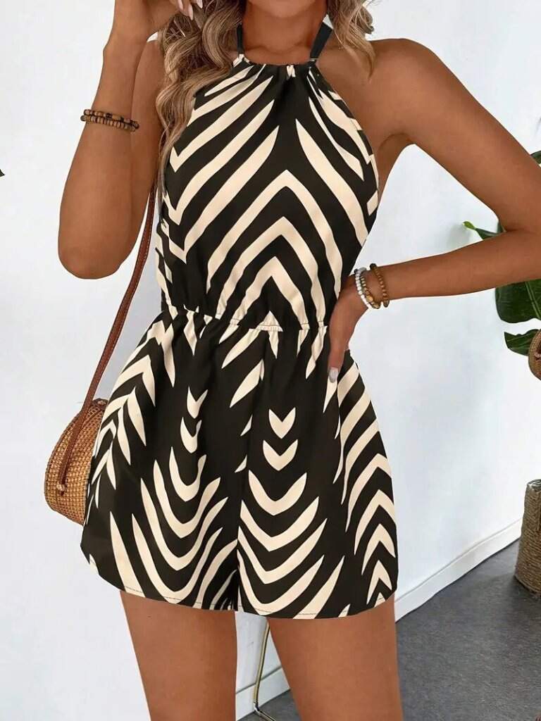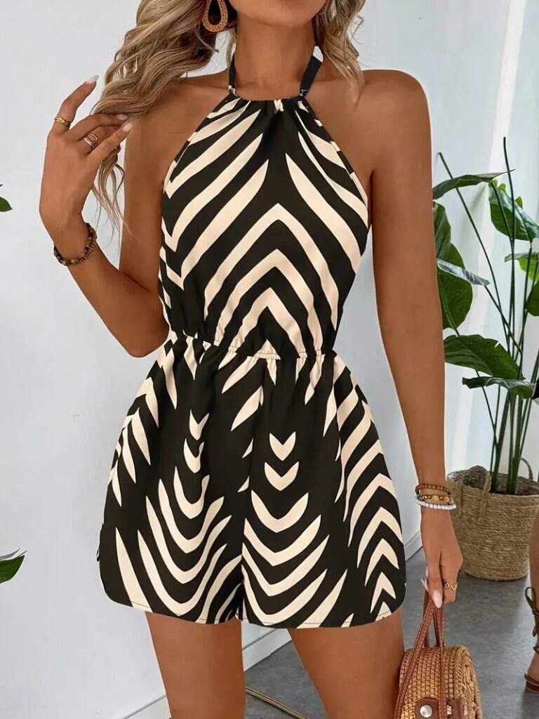 Kadın Boyundan Askılı Halter Yakalı Desenli Süprem Tulum